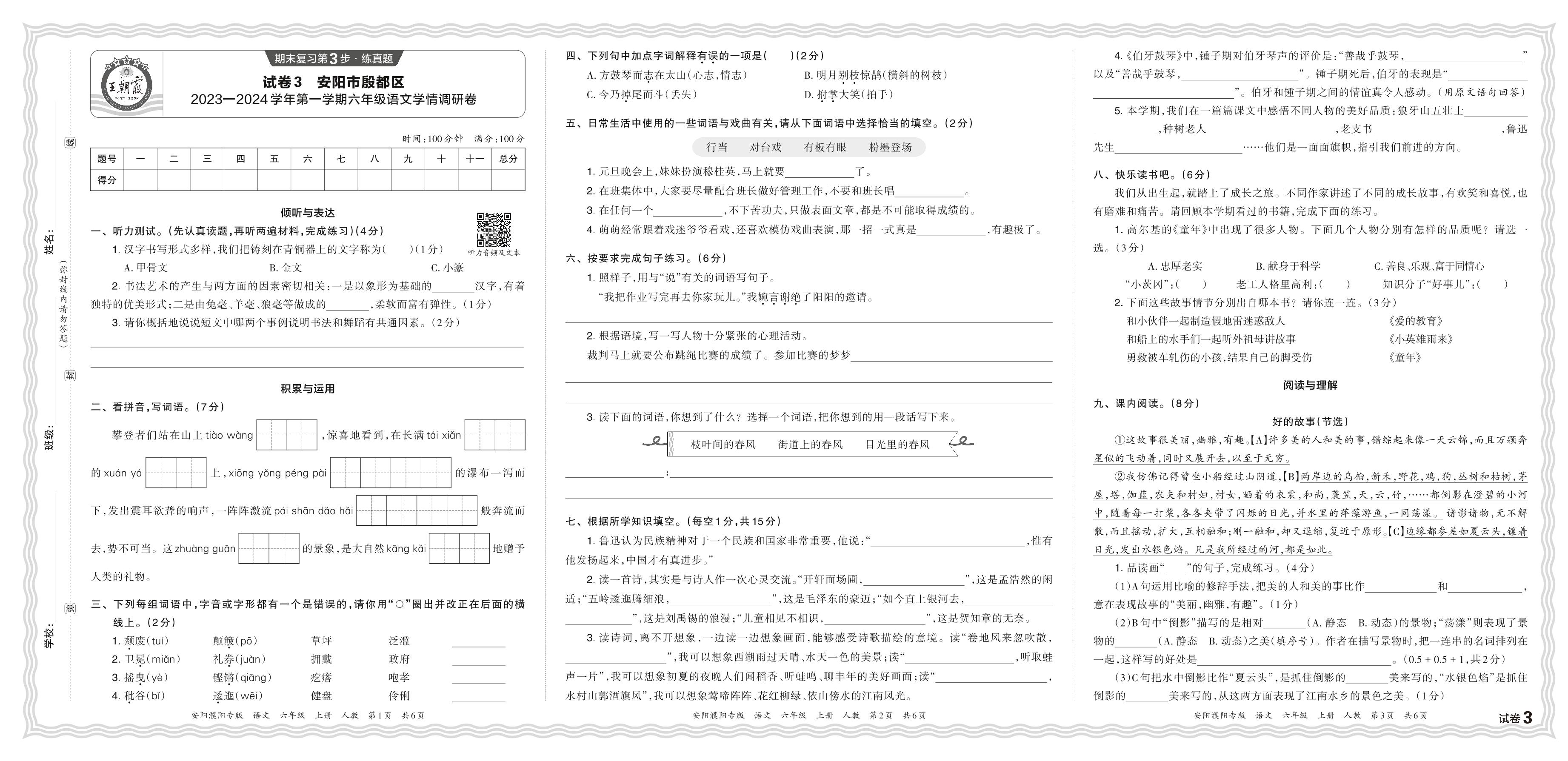 河南省安阳市殷都区2023—2024学年第一学期六年级语文学情调研卷(人教版)【3】