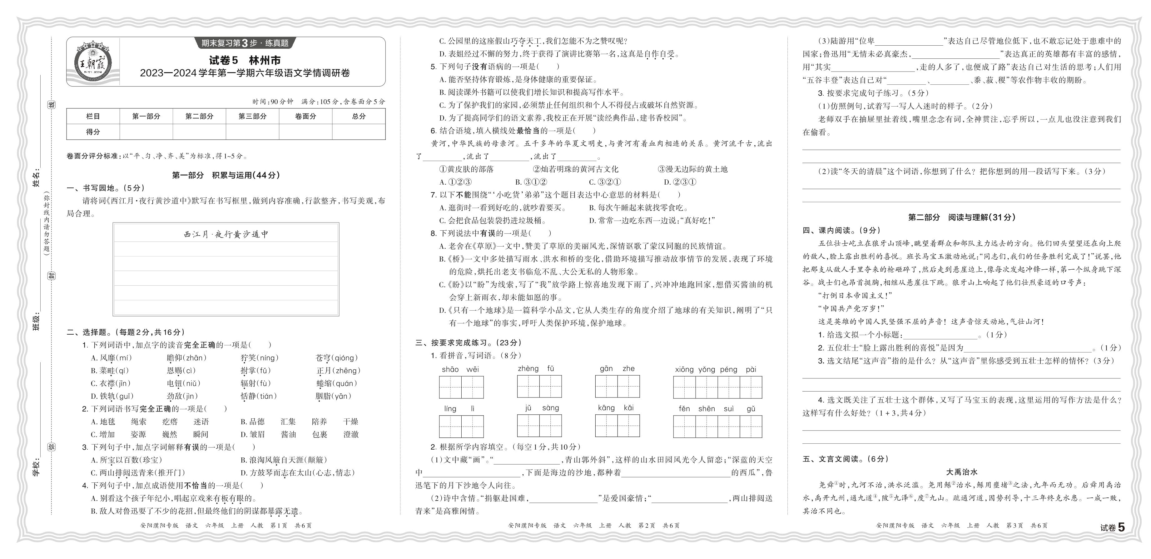 河南省林州市2023—2024学年第一学期六年级语文学情调研卷(人教版)【5】