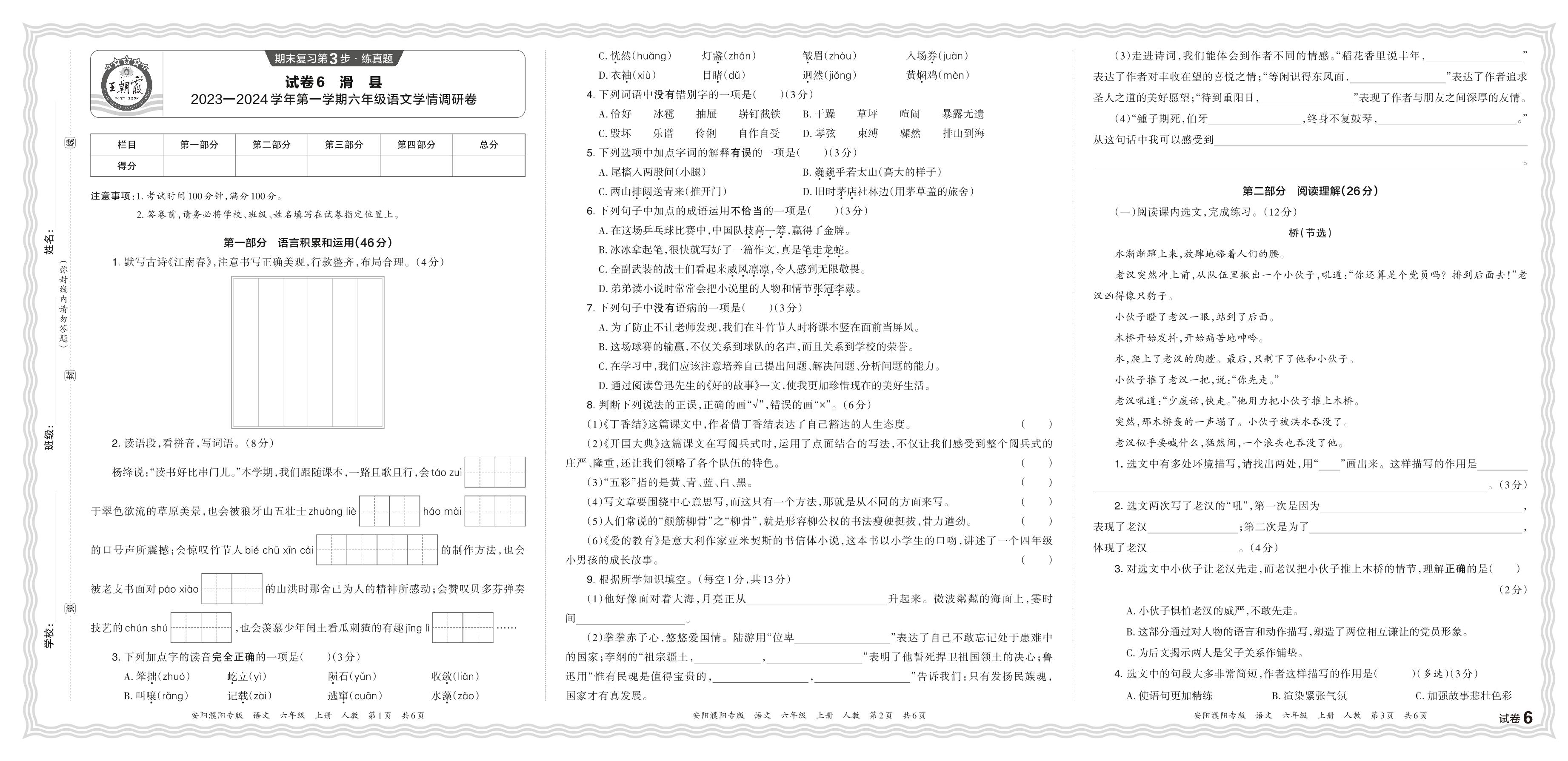 河南省安阳市滑县2023—2024 学年第一学期六年级语文学情调研卷(人教版)【6】