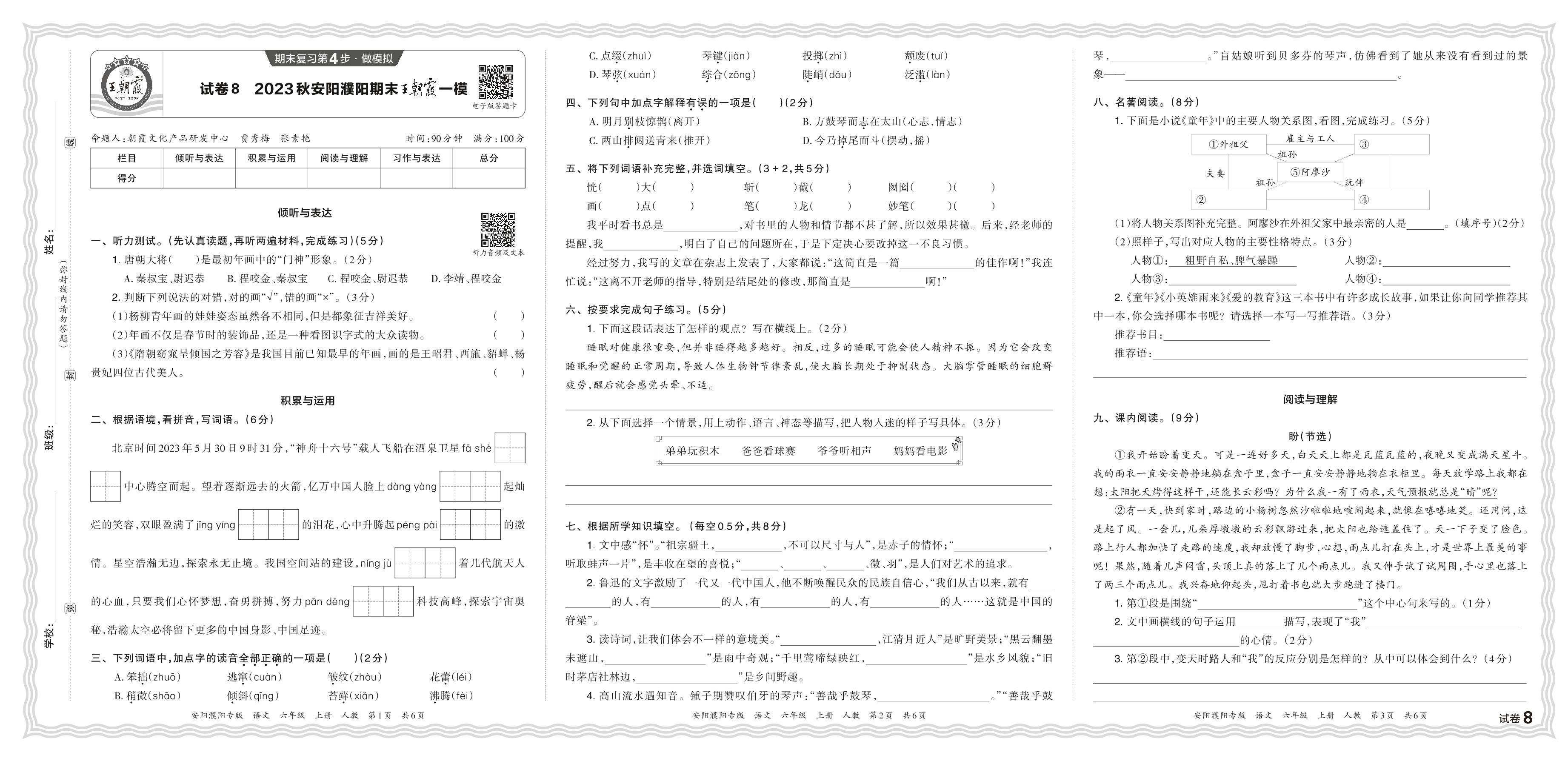 2023秋上册六年级语文人教版 河南安阳濮阳期末王朝霞一模【8】