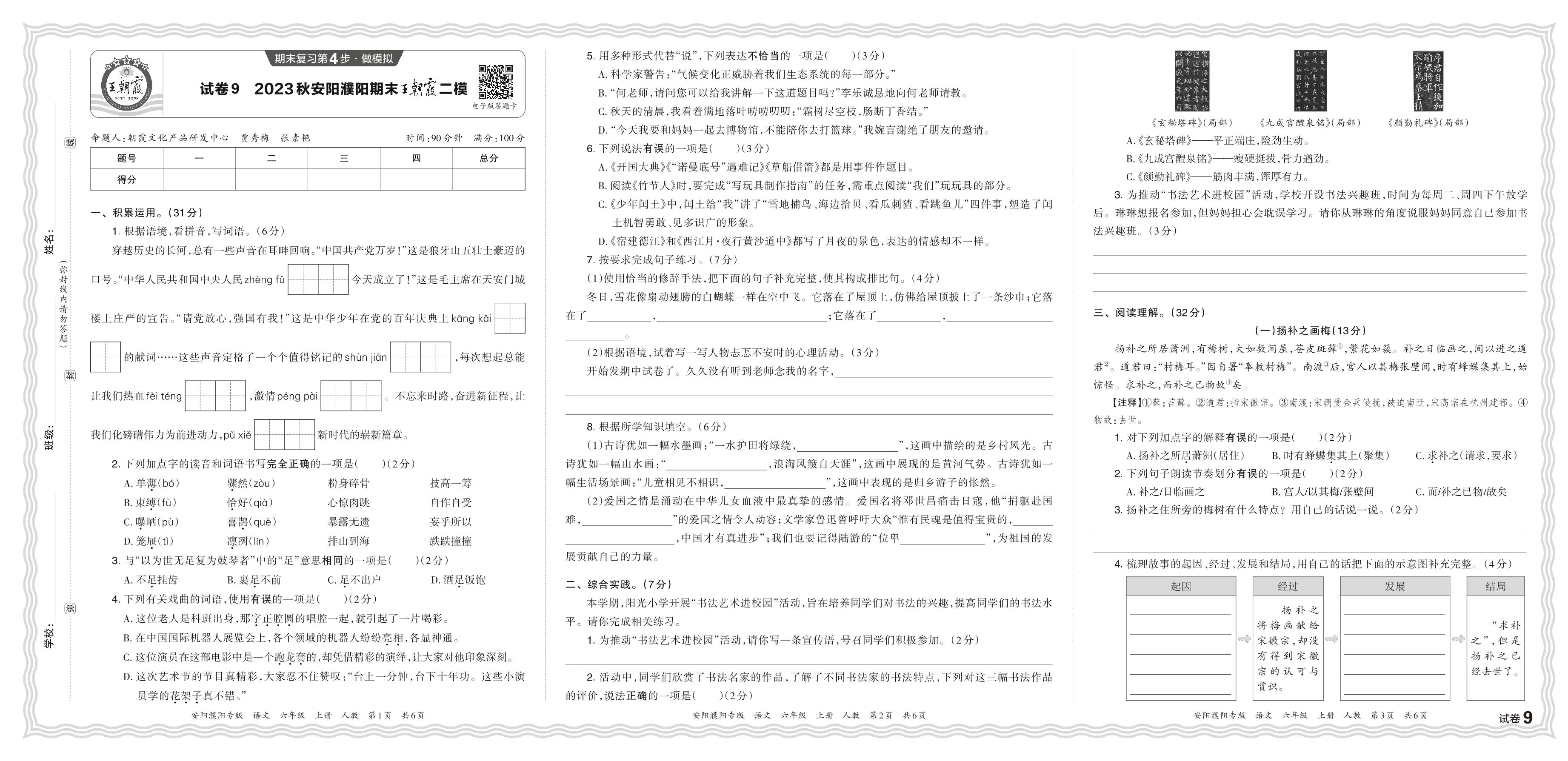 2023秋上册六年级语文人教版 河南安阳濮阳期末王朝霞二模【9】