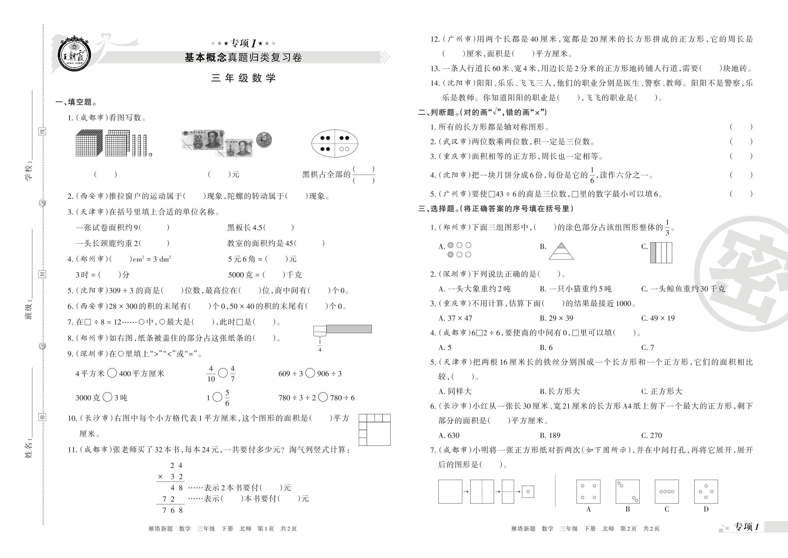 王朝霞期末专项卷——基本概念、计算真题归类复习三年级下册数学(北师版)_R21080483924【0】