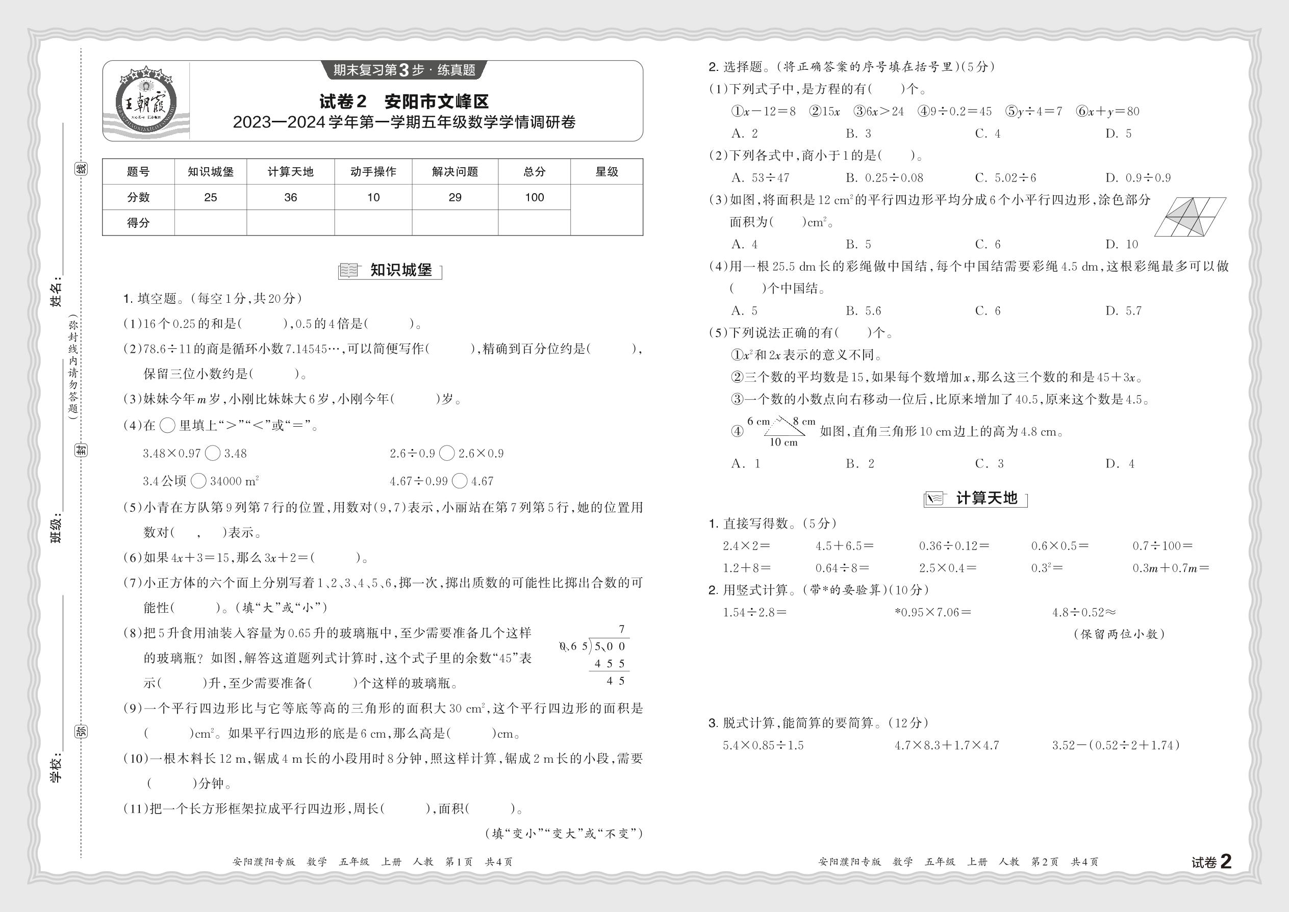河南省安阳市文峰区2023—2024 学年第一学期五年级数学学情调研卷(人教版)【2】