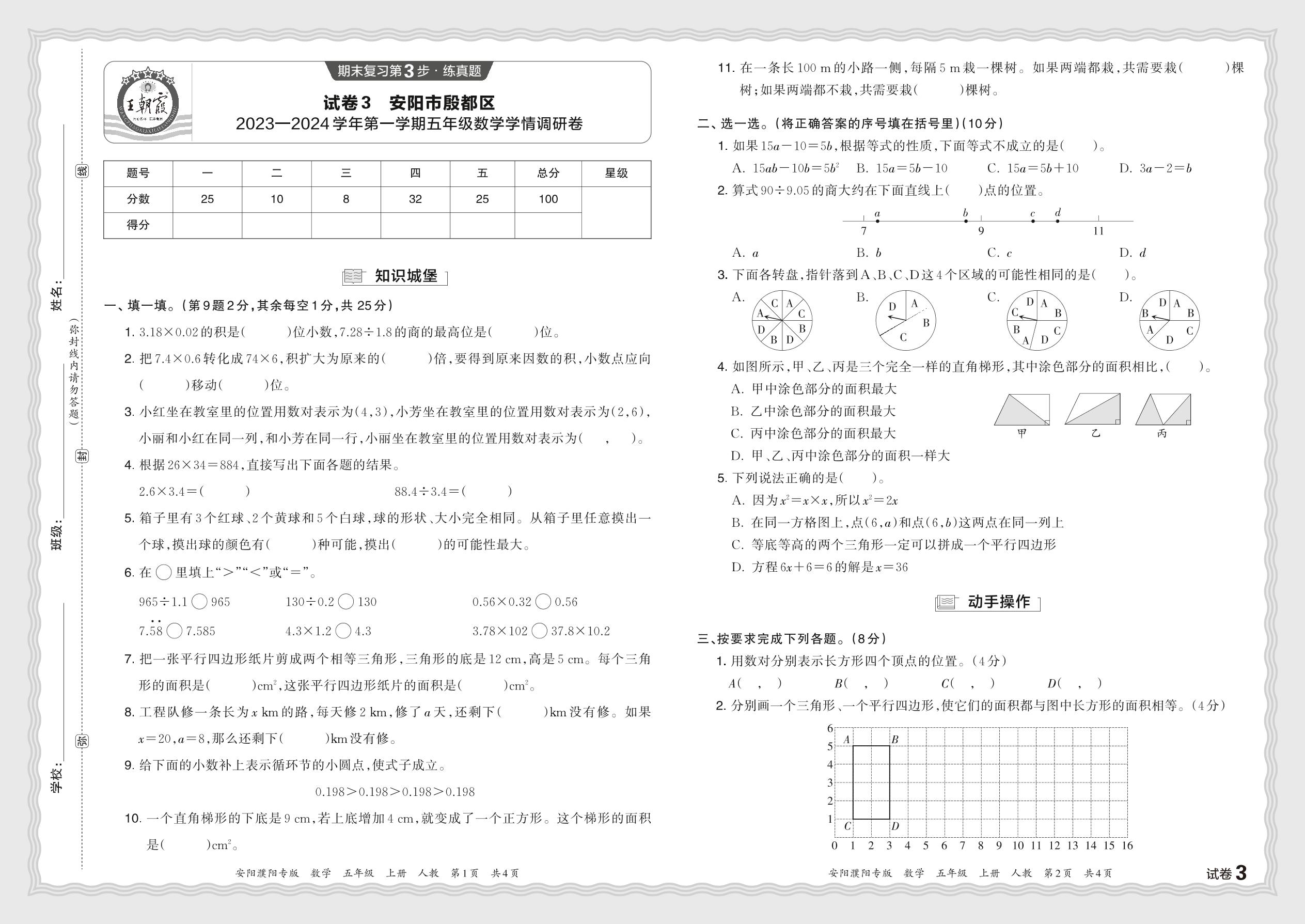 河南省安阳市殷都区2023—2024学年第一学期五年级数学学情调研卷(人教版)【3】