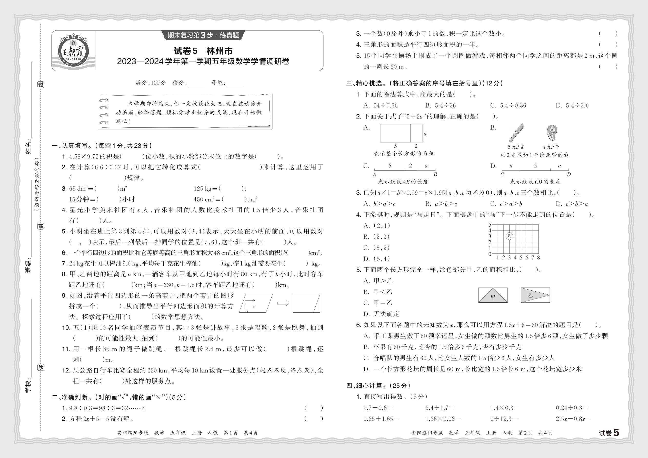 河南省安阳市林州市2023—2024学年第一学期五年级数学学情调研卷(人教版)【5】