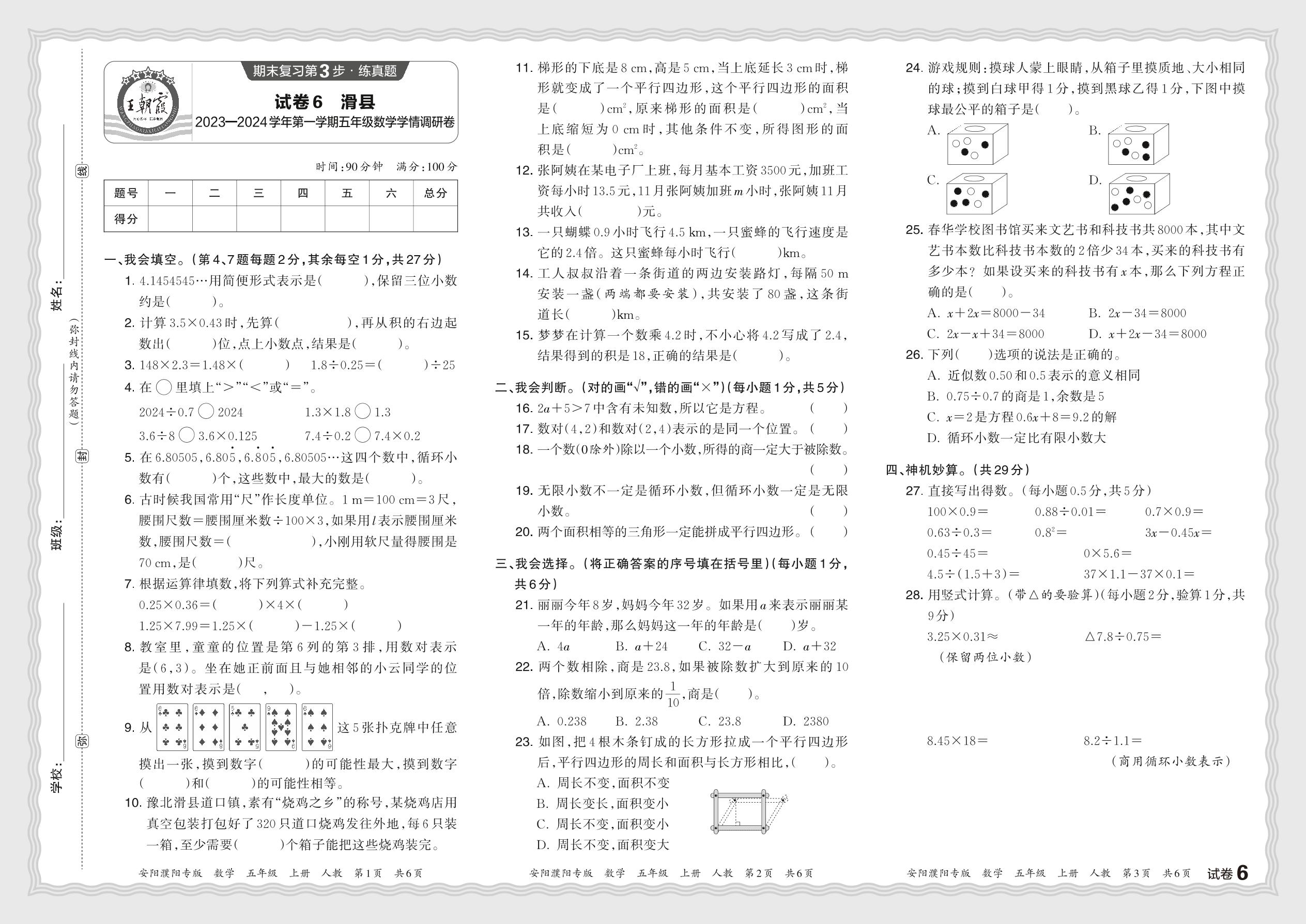 河南省安阳市滑县2023—2024 学年第一学期五年级数学学情调研卷(人教版)【6】