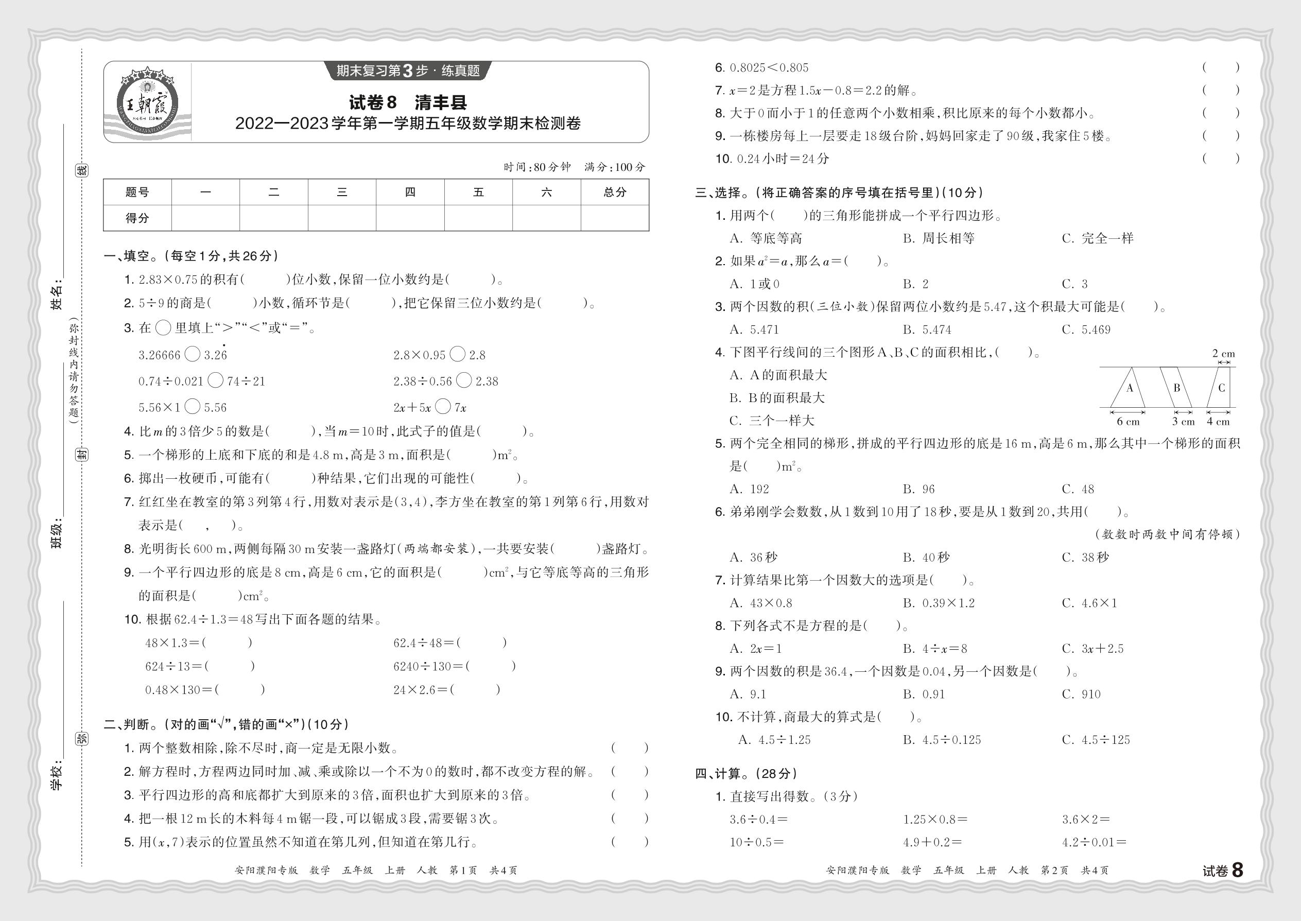 河南省安阳市清丰县2023—2024学年第一学期五年级数学学情调研卷(人教版)【8】