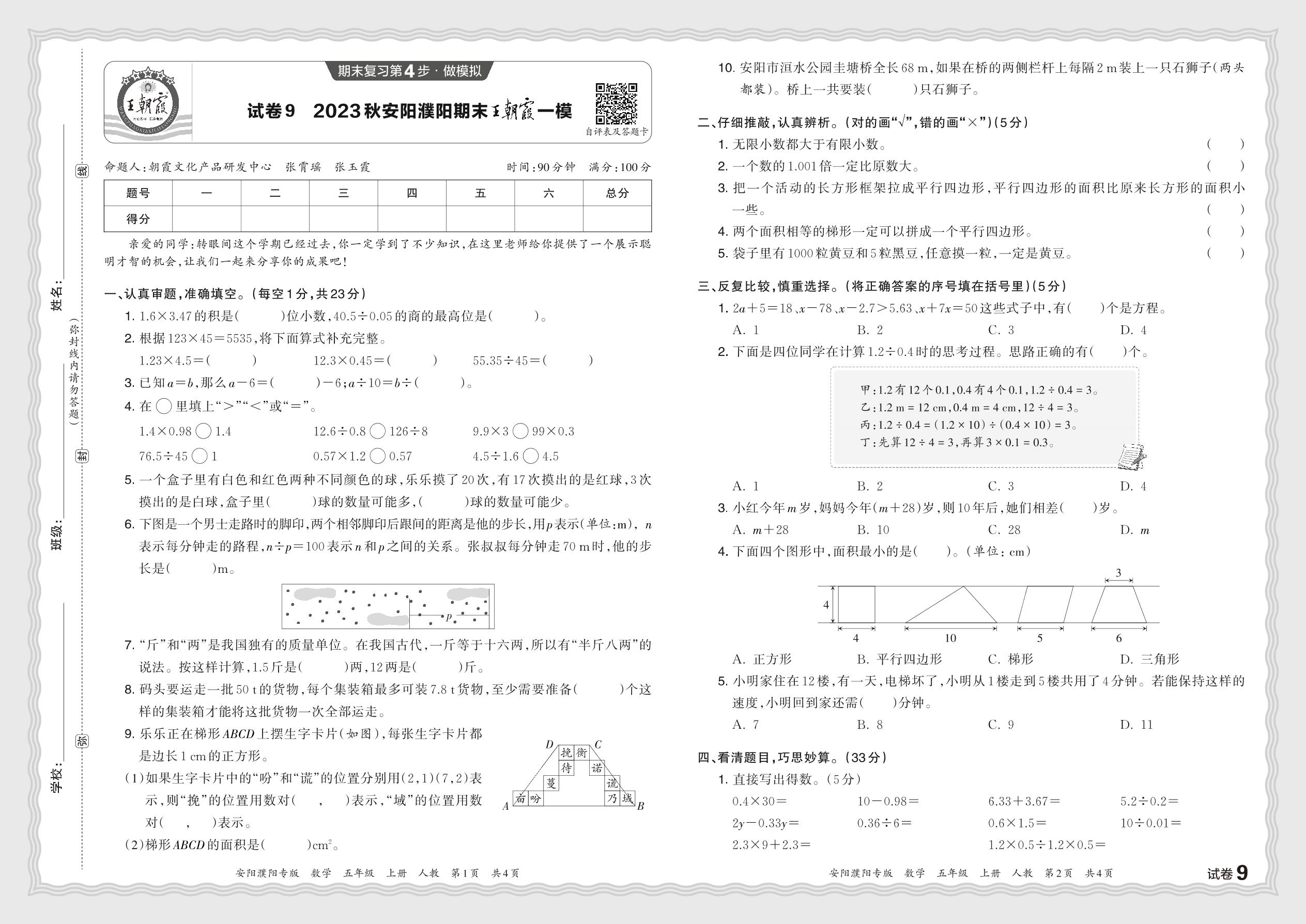 2023秋上册五年级数学人教版 河南安阳濮阳期末王朝霞一模【9】