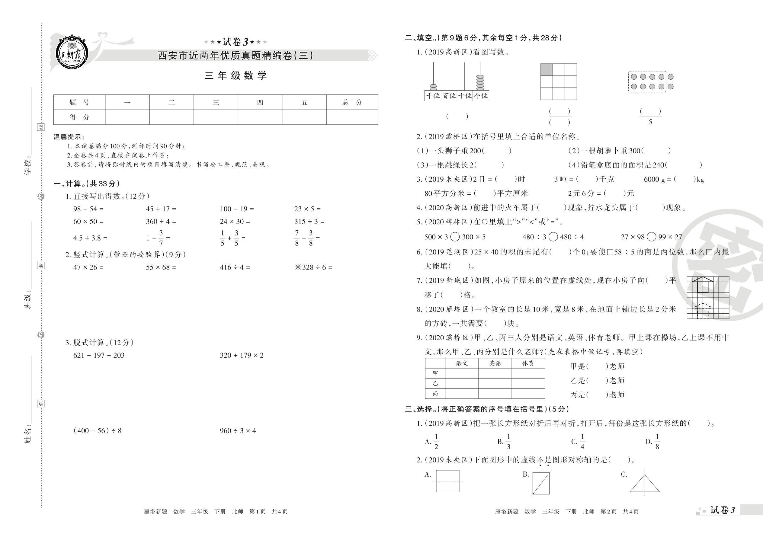 优质试题精编卷(三)三年级下册数学(北师版)【3】
