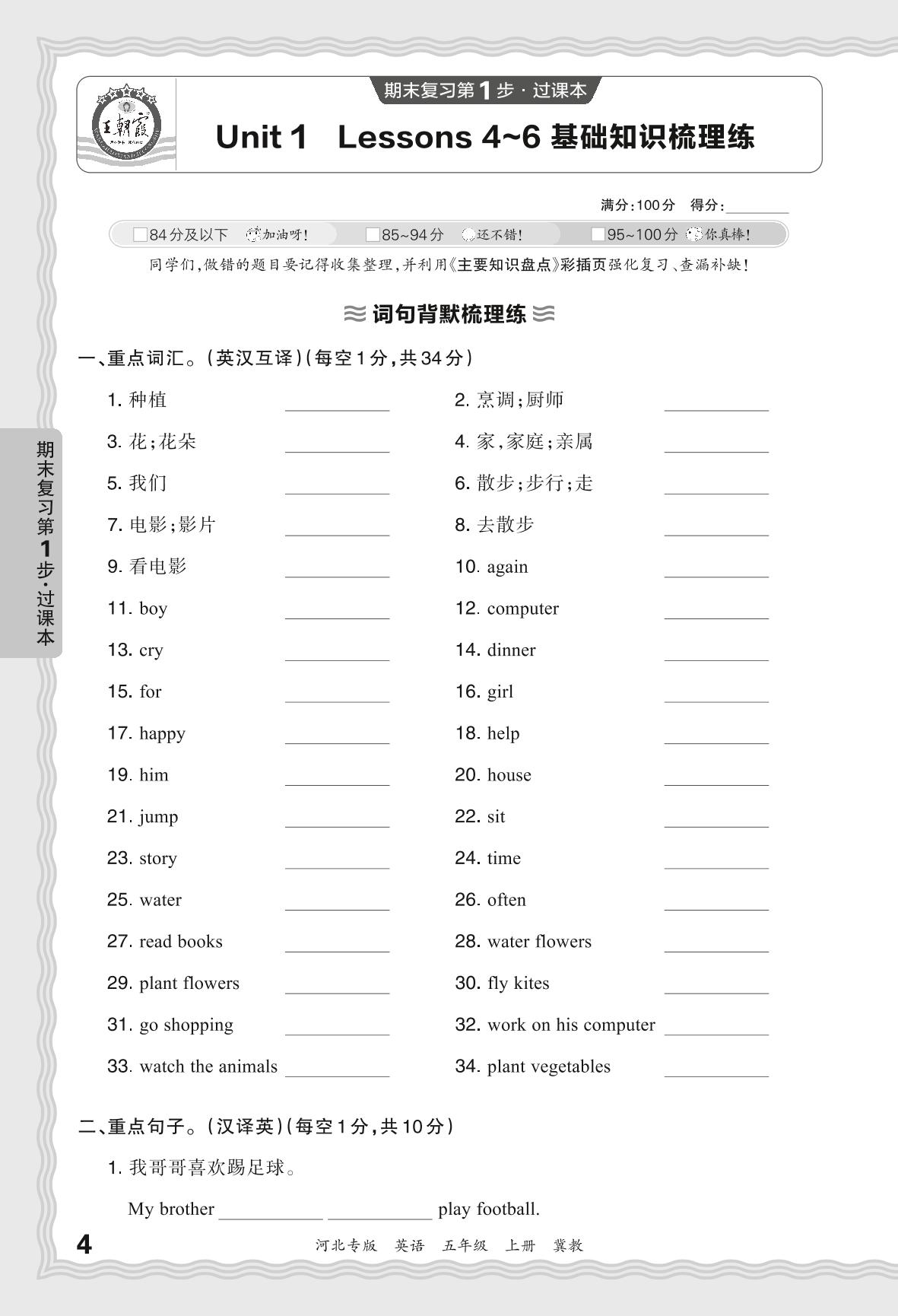 2023秋上册五年级英语冀教版 期末过课本·Unit 1 Lessons 4-6 基础知识梳理练