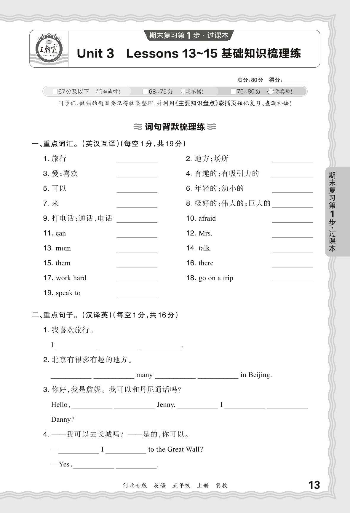 2023秋上册五年级英语冀教版 期末过课本·Unit 3 Lessons 13-15 基础知识梳理练