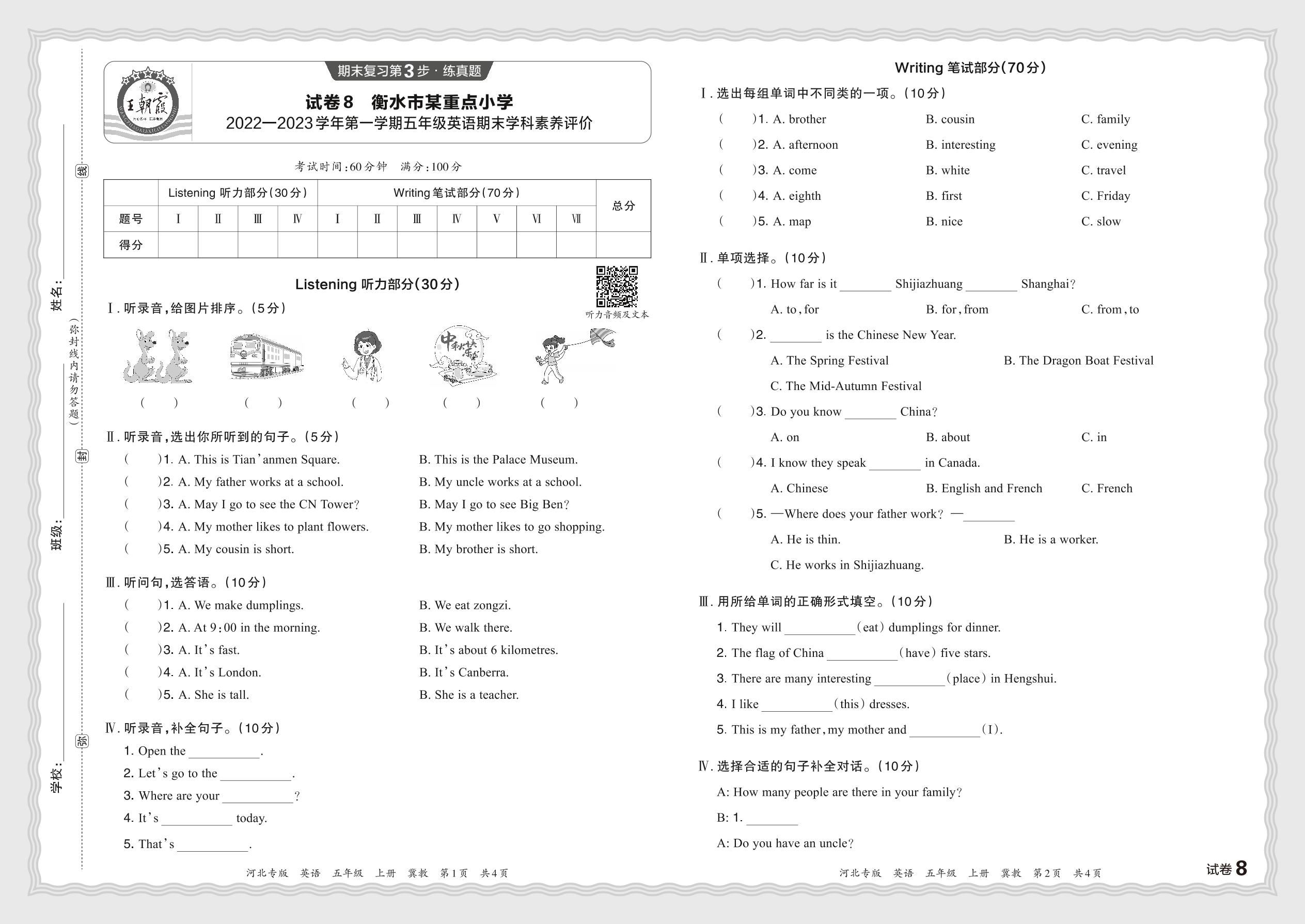 五年级英语冀教版上册期末卷