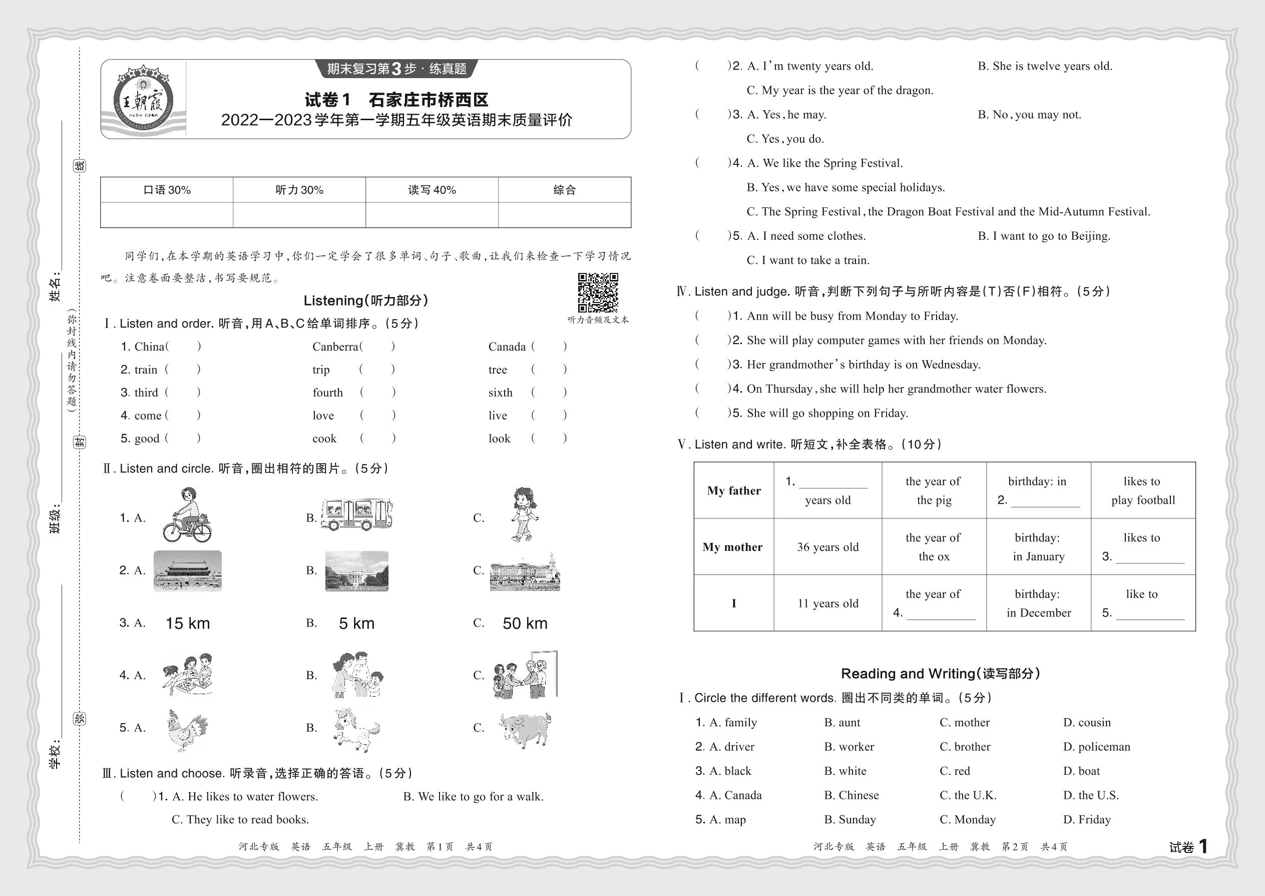 河北省石家庄市桥西区2022—2023学年第一学期五年级英语期末质量评价试题(冀教版)【1】