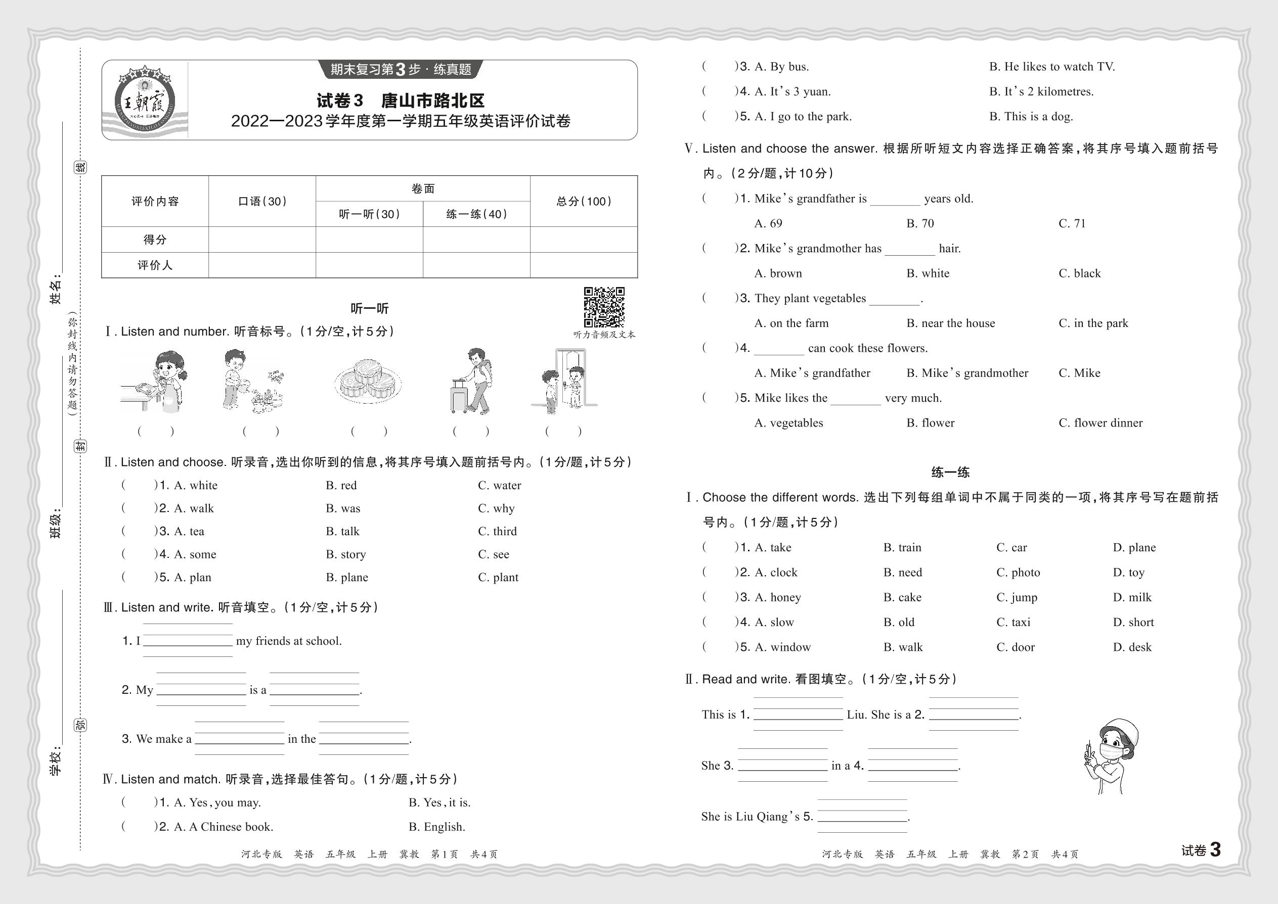 河北省唐山市路北区2022—2023学年度第一学期五年级英语期末评价试卷(冀教版)【3】