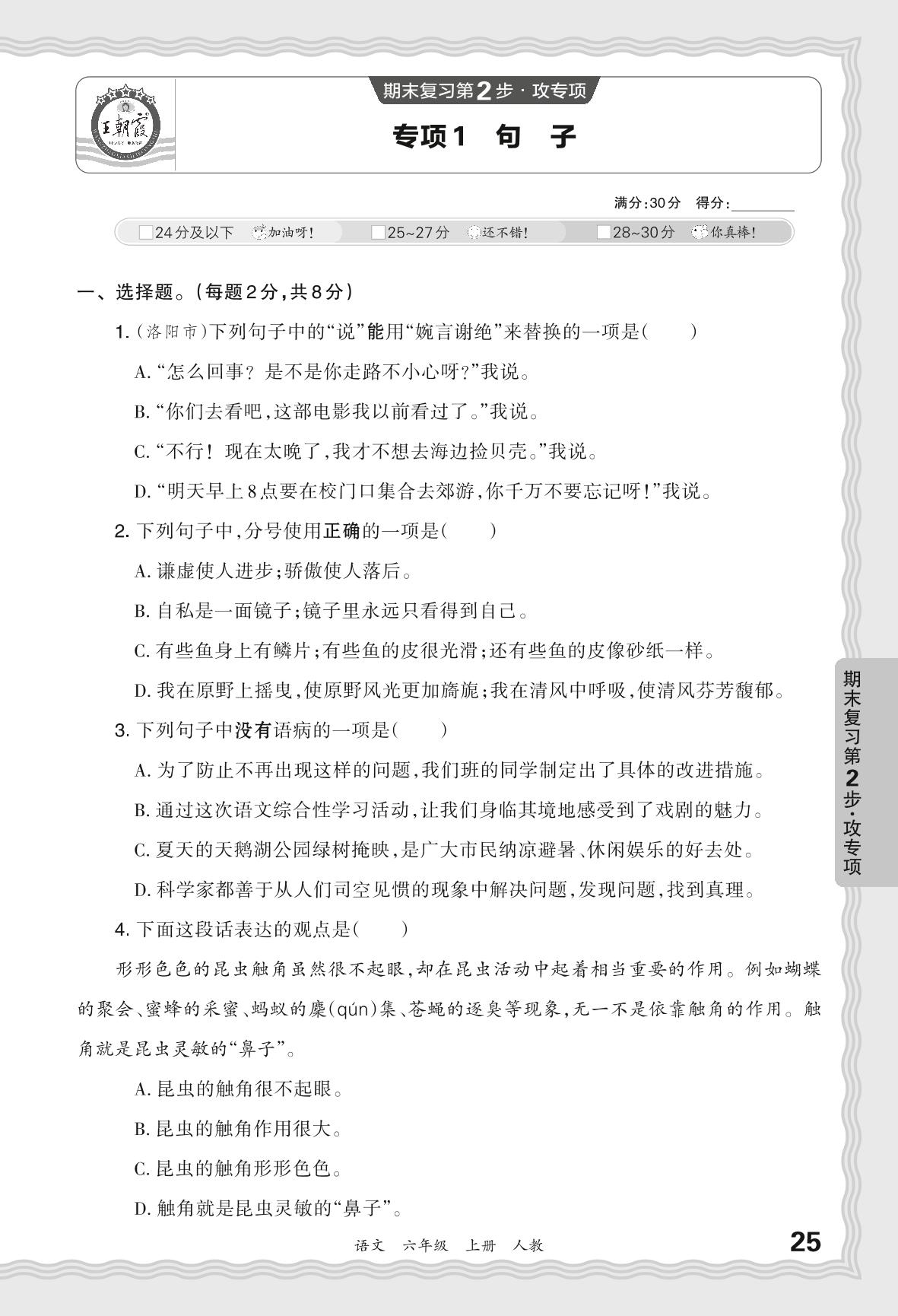 2023秋上册六年级语文人教版 期末专项·句子【1】
