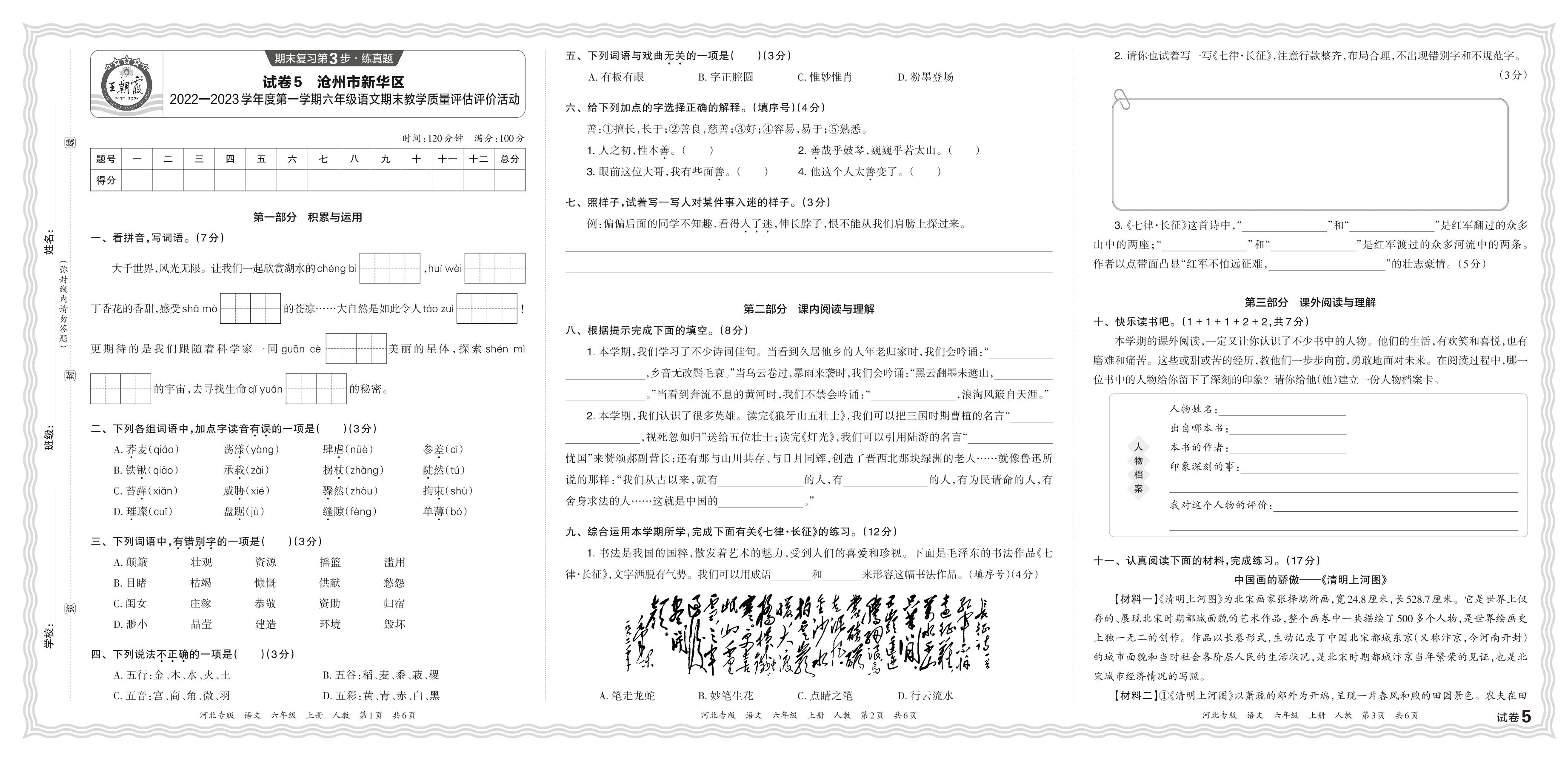 河北省沧州市新华区2022—2023学年度第一学期六年级语文期末教学质量评估评价活动(人教版)【5】