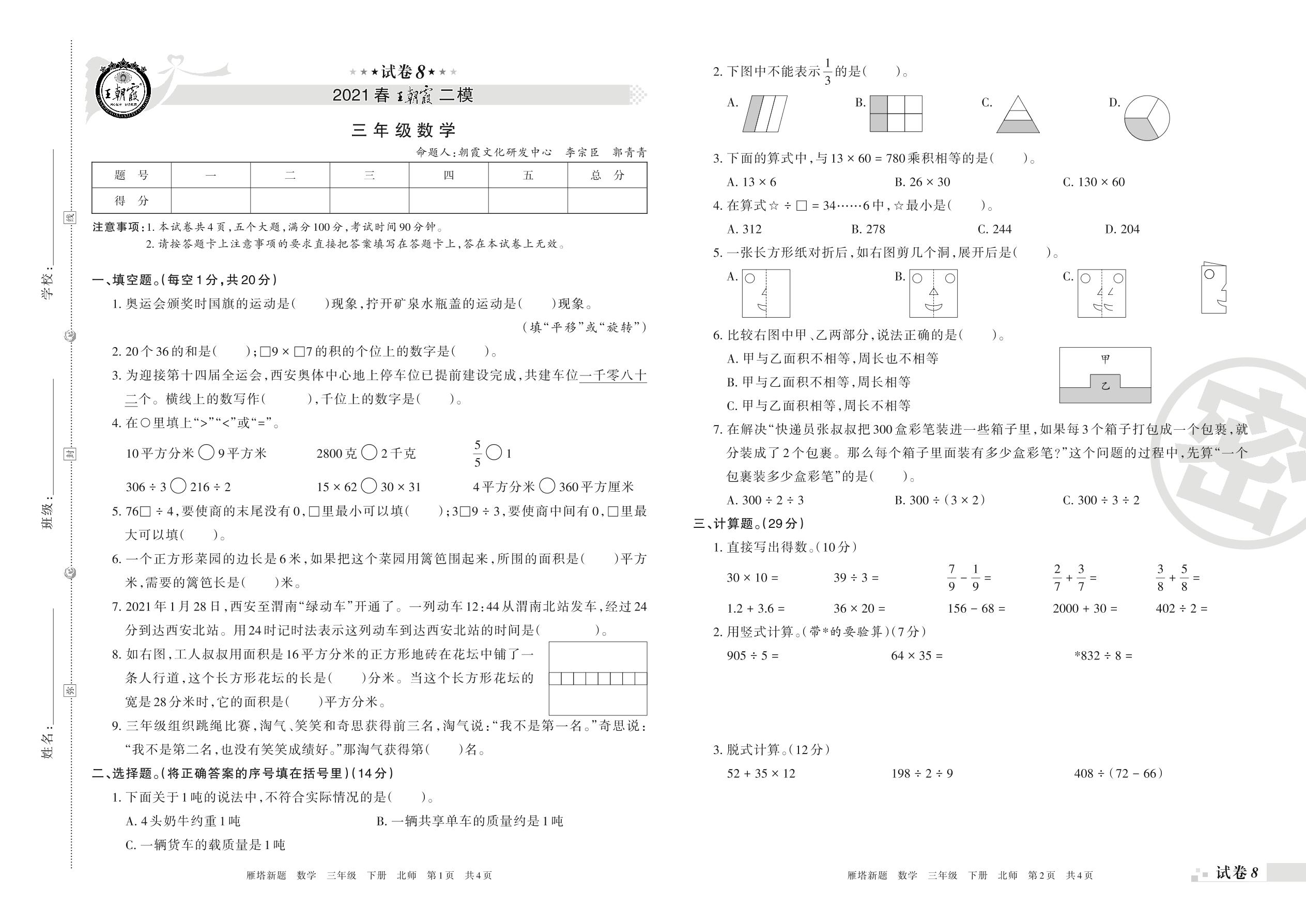 王朝霞期末模拟卷三年级下册数学(北师版)_R21080484000【8】