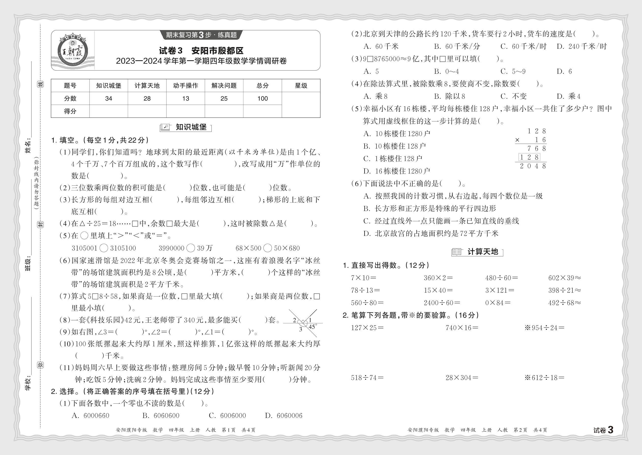 河南省安阳市殷都区2023—2024学年第一学期四年级数学学情调研卷(人教版)【3】