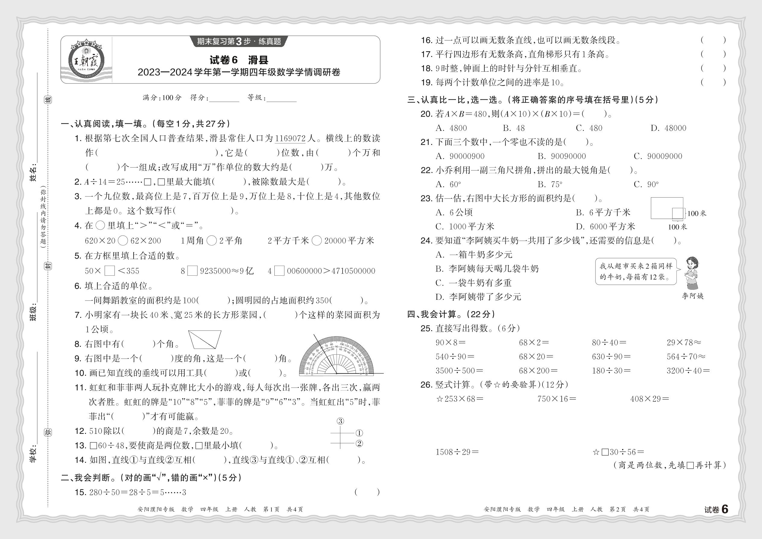河南省安阳市滑县2023—2024学年第一学期四年级数学学情调研卷(人教版)【6】