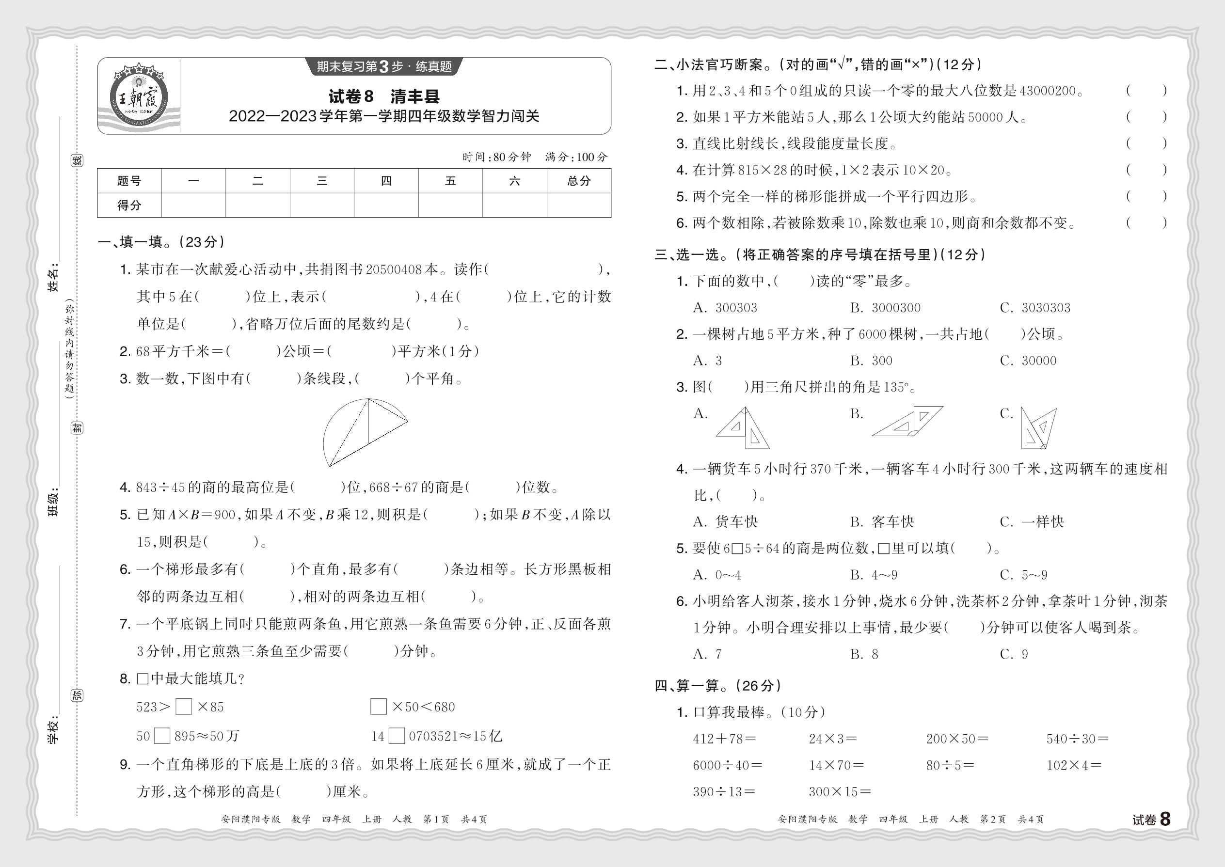 河南省安阳市清丰县2023—2024学年第一学期四年级数学学情调研卷(人教版)【8】