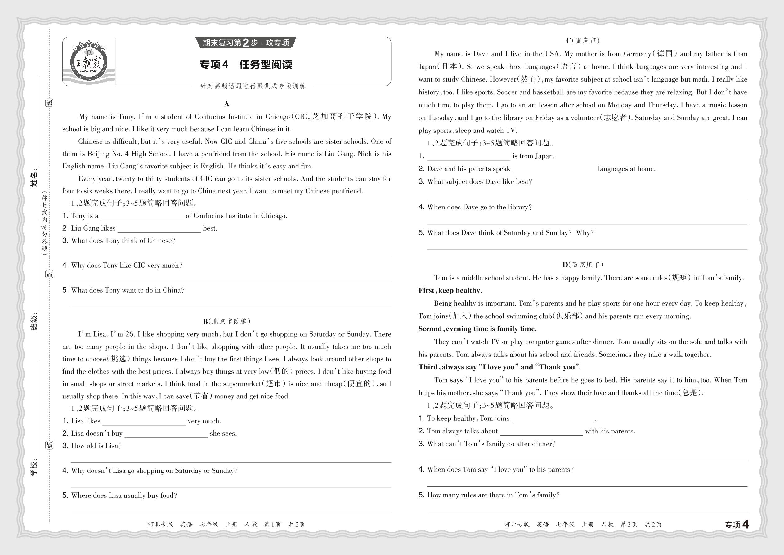 2023秋上册七年级英语人教版 期末专项卷·任务型阅读_R231124155126670【4】