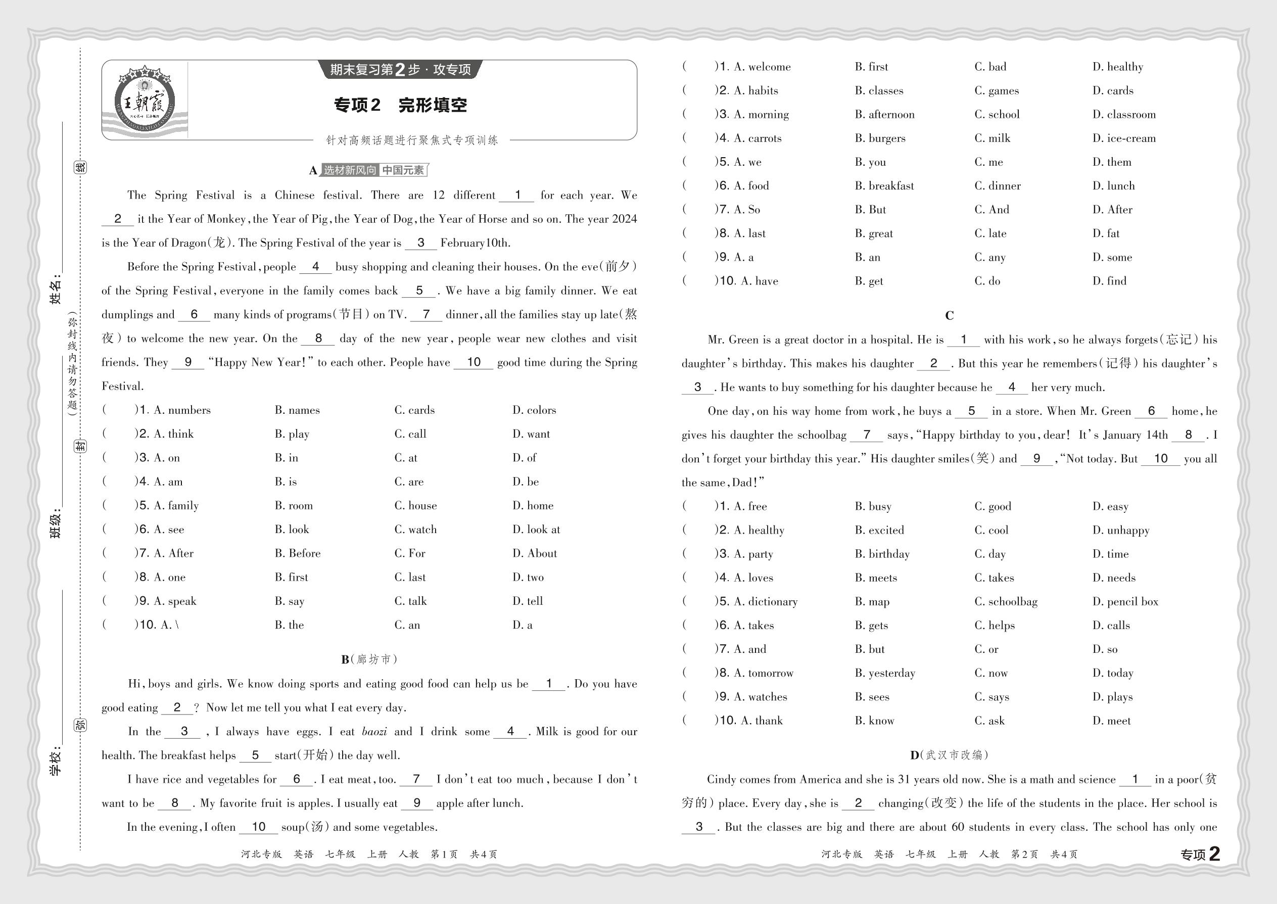 2023秋上册七年级英语人教版 期末专项卷·完形填空_R231124155126327【2】