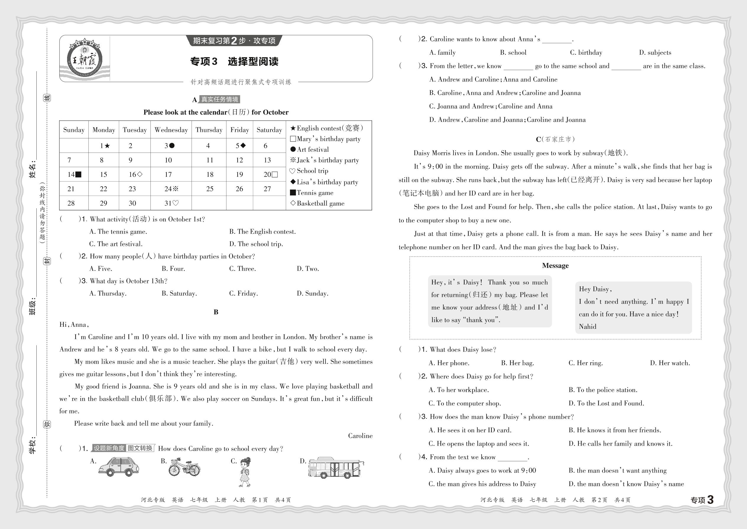 2023秋上册七年级英语人教版 期末专项卷·选择型阅读_R231124155127384【3】