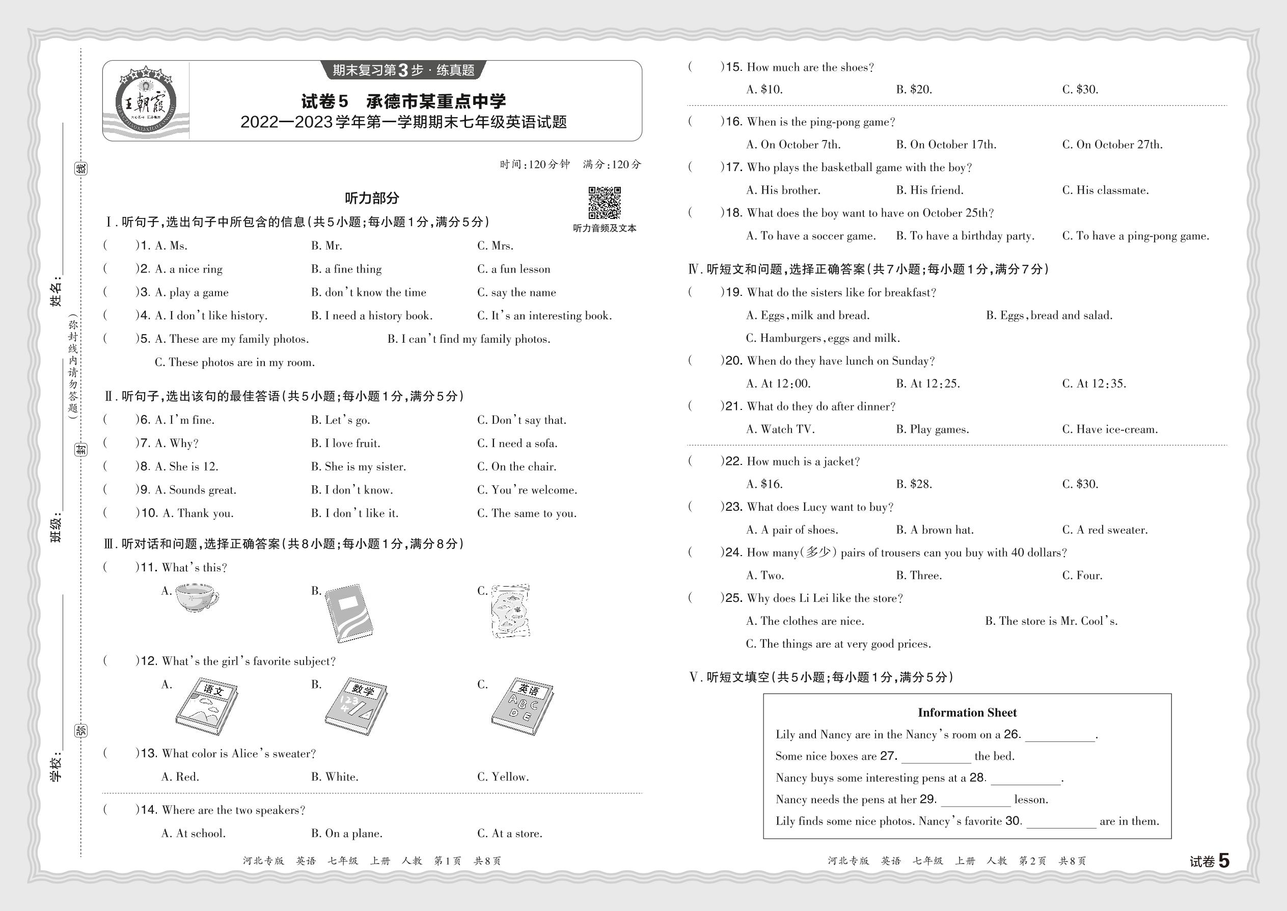 河北省承德市某重点中学2022—2023学年第一学期期末七年级英语试题(人教版)【5】
