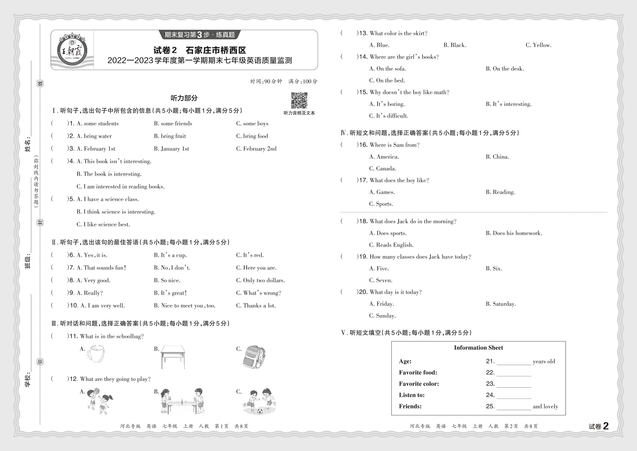 河北省石家庄市桥西区2022—2023学年度第一学期期末七年级英语质量监测(人教版)【2】