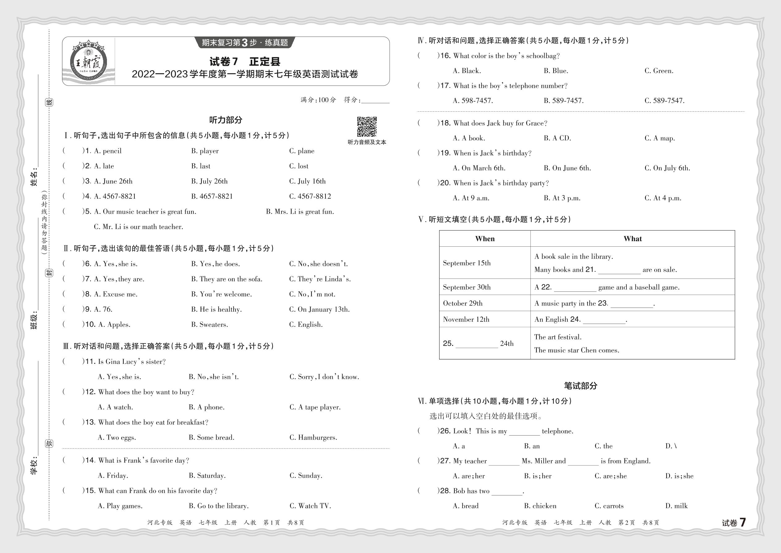 河北省石家庄市正定县2022—2023学年度第一学期期末七年级英语测试试卷(人教版)【7】