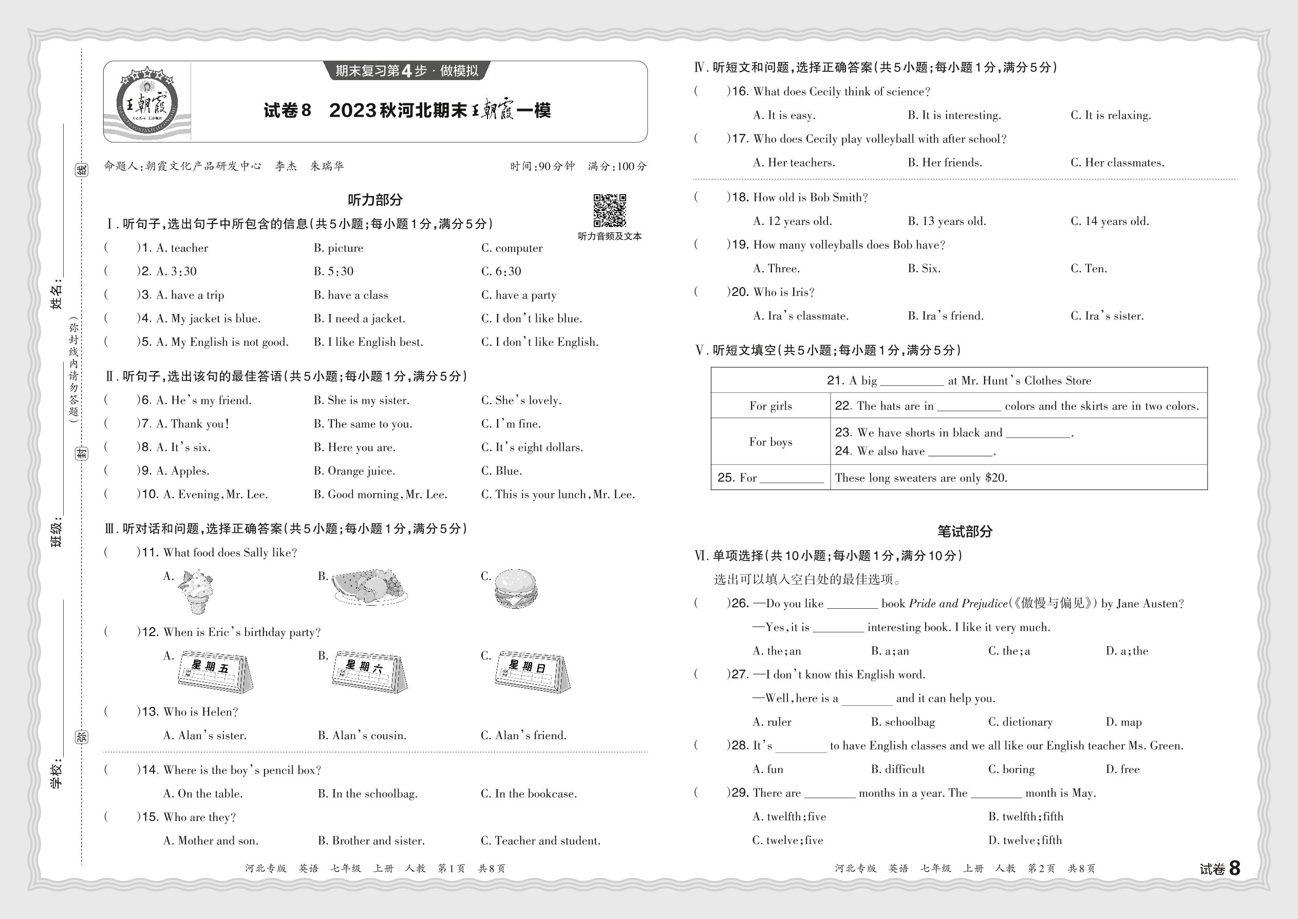 2023秋上册七年级英语人教版 河北期末王朝霞一模