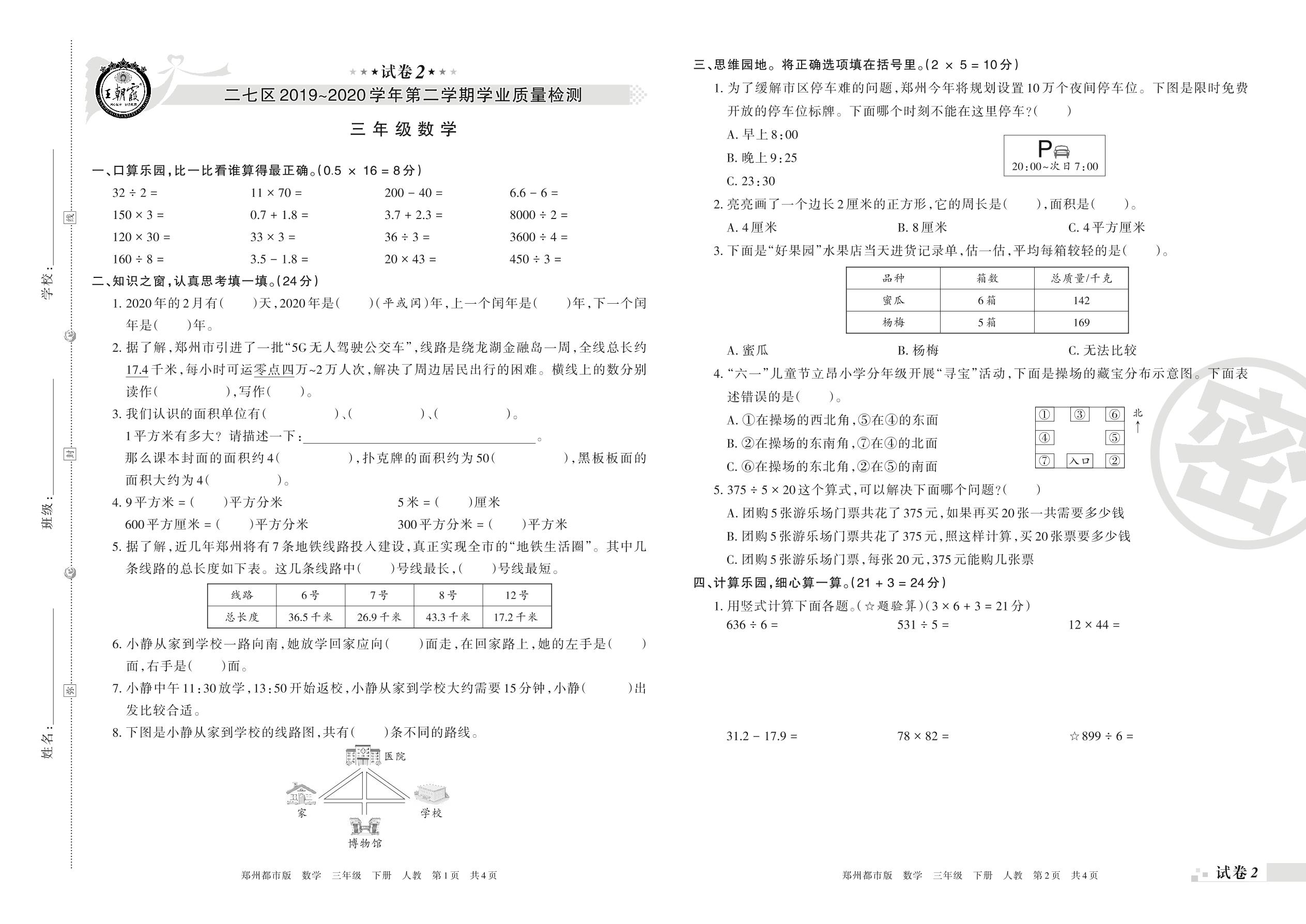 2019-2020学年第二学期郑州市二七区三年级数学试卷(人教版)【2】