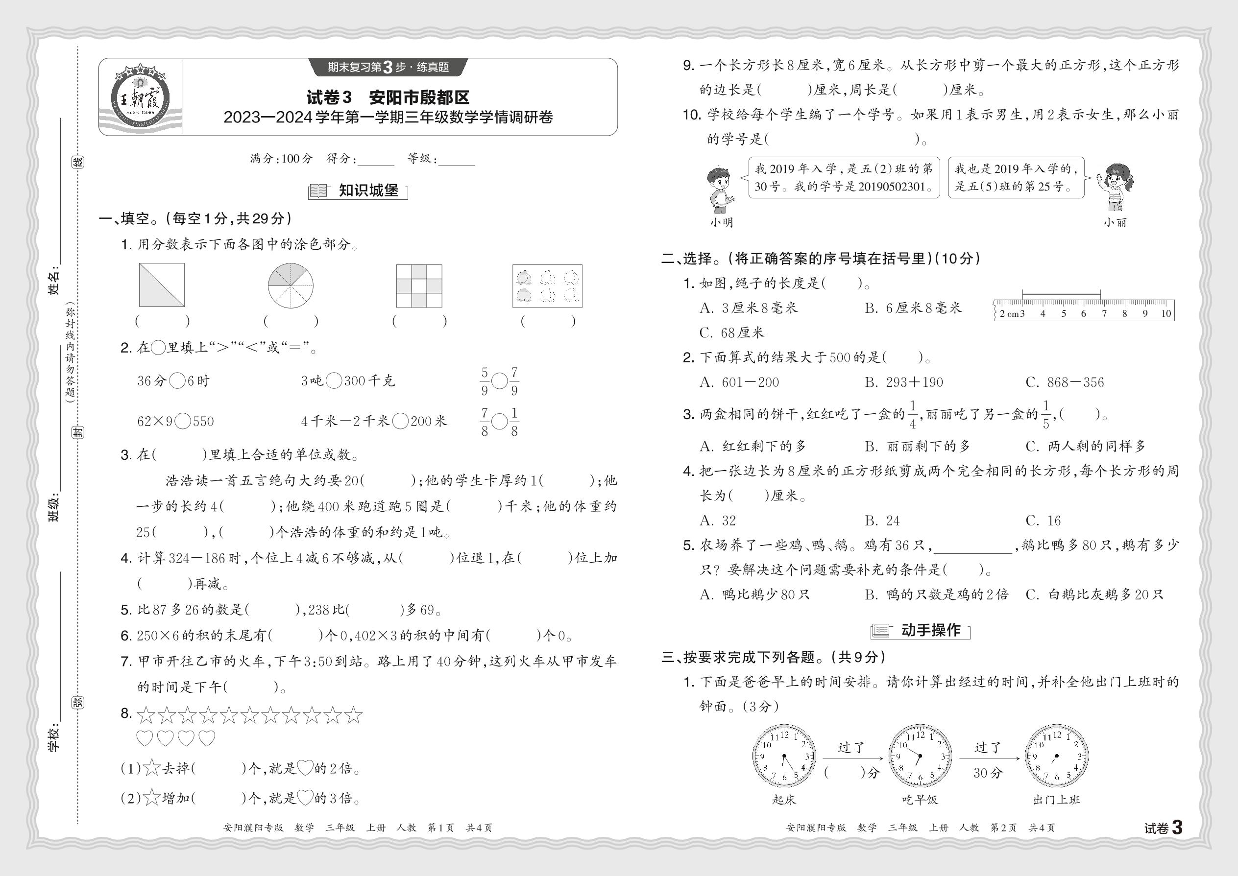 河南省安阳市殷都区2023—2024学年第一学期三年级数学学情调研卷(人教版)【3】