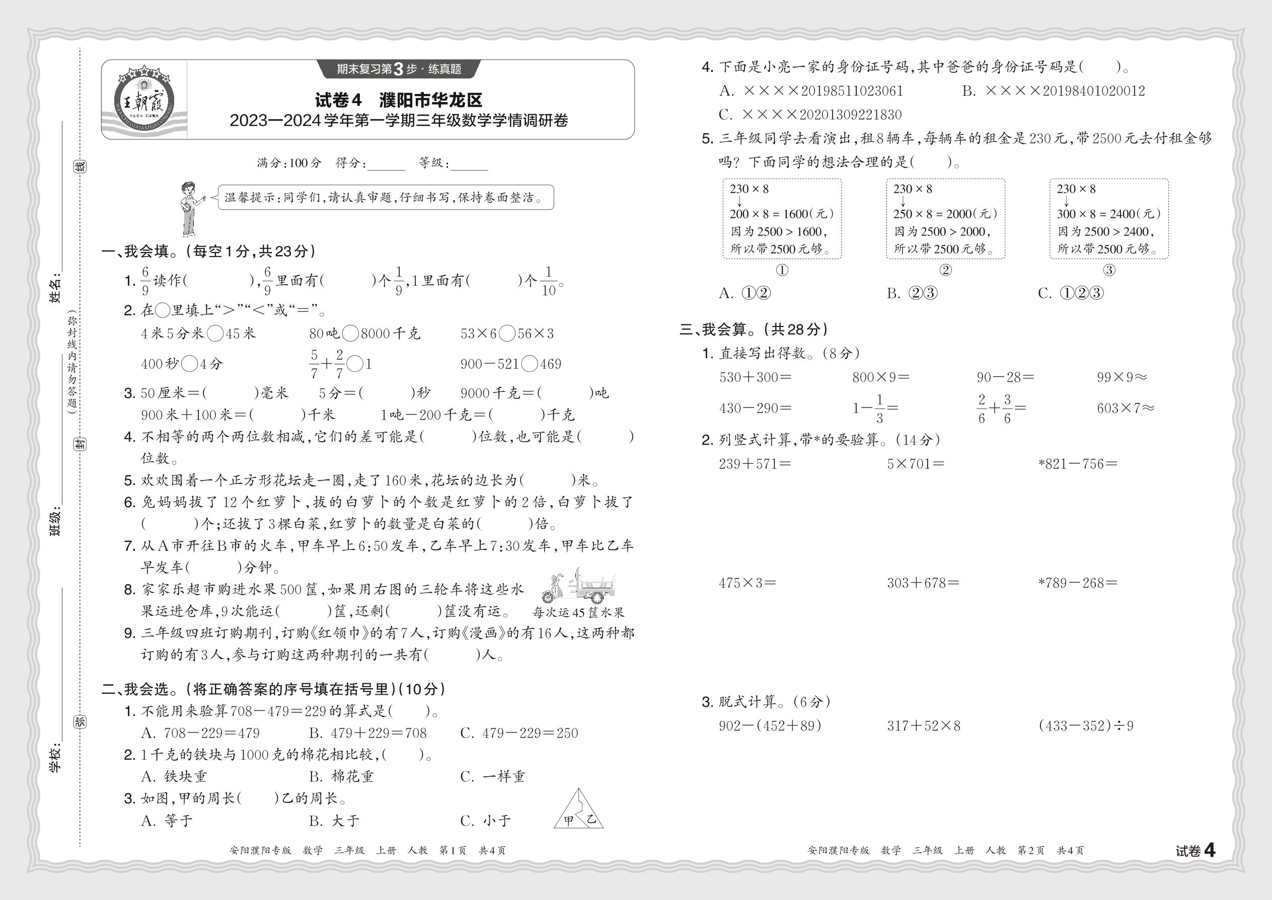 河南省濮阳市华龙区2023—2024学年第一学期三年级数学学情调研卷(人教版)【4】