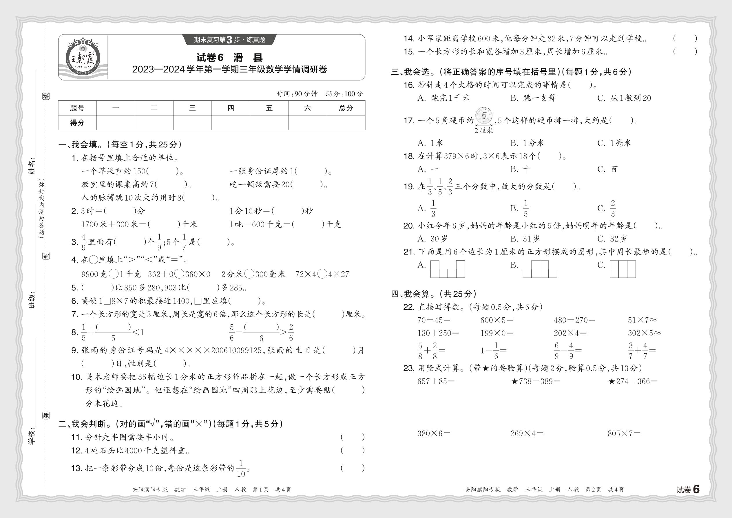 河南省安阳市滑县2023—2024学年第一学期三年级数学学情调研卷(人教版)【6】
