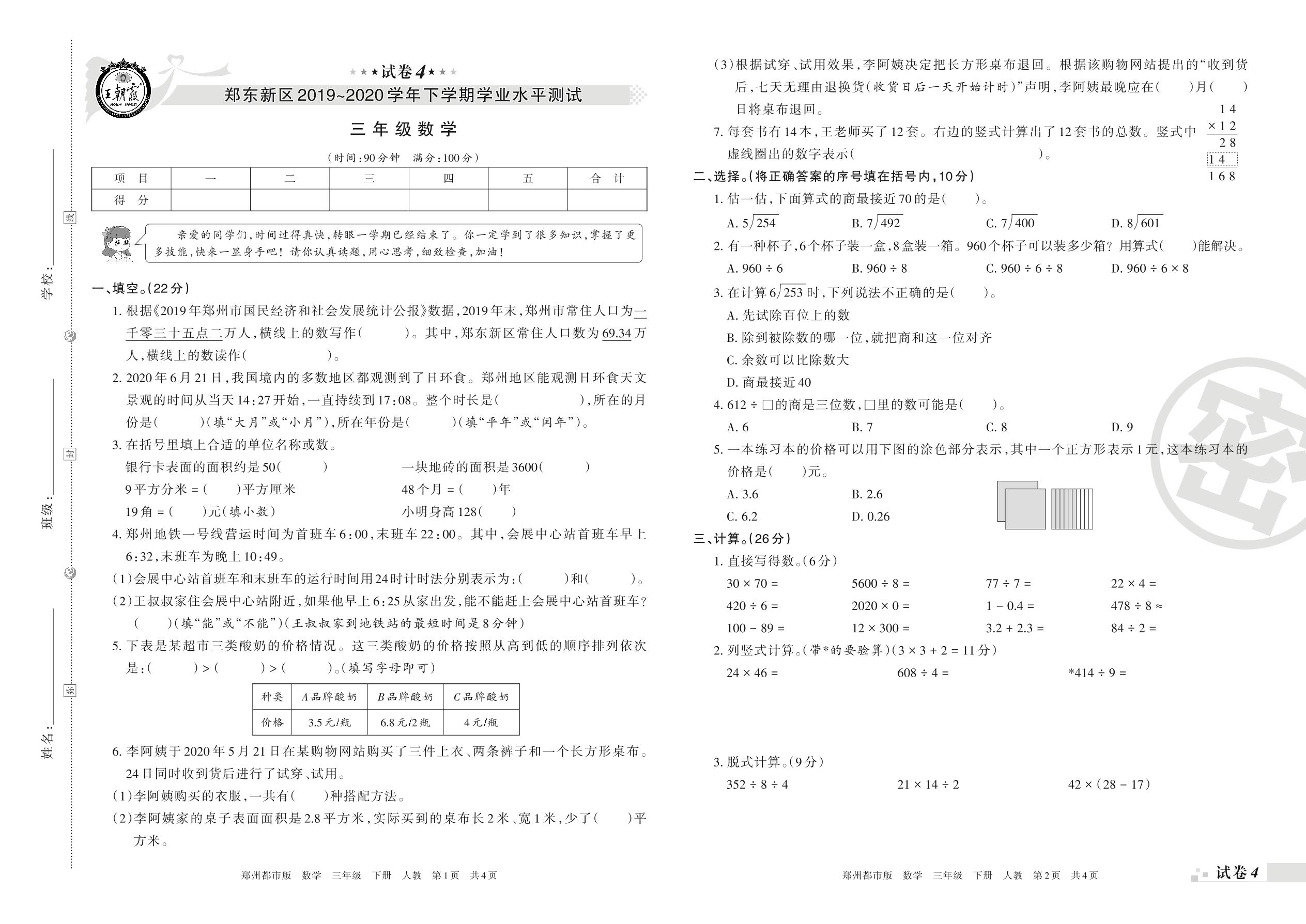 2019-2020学年第二学期郑州市郑东新区三年级数学试卷(人教版)【4】