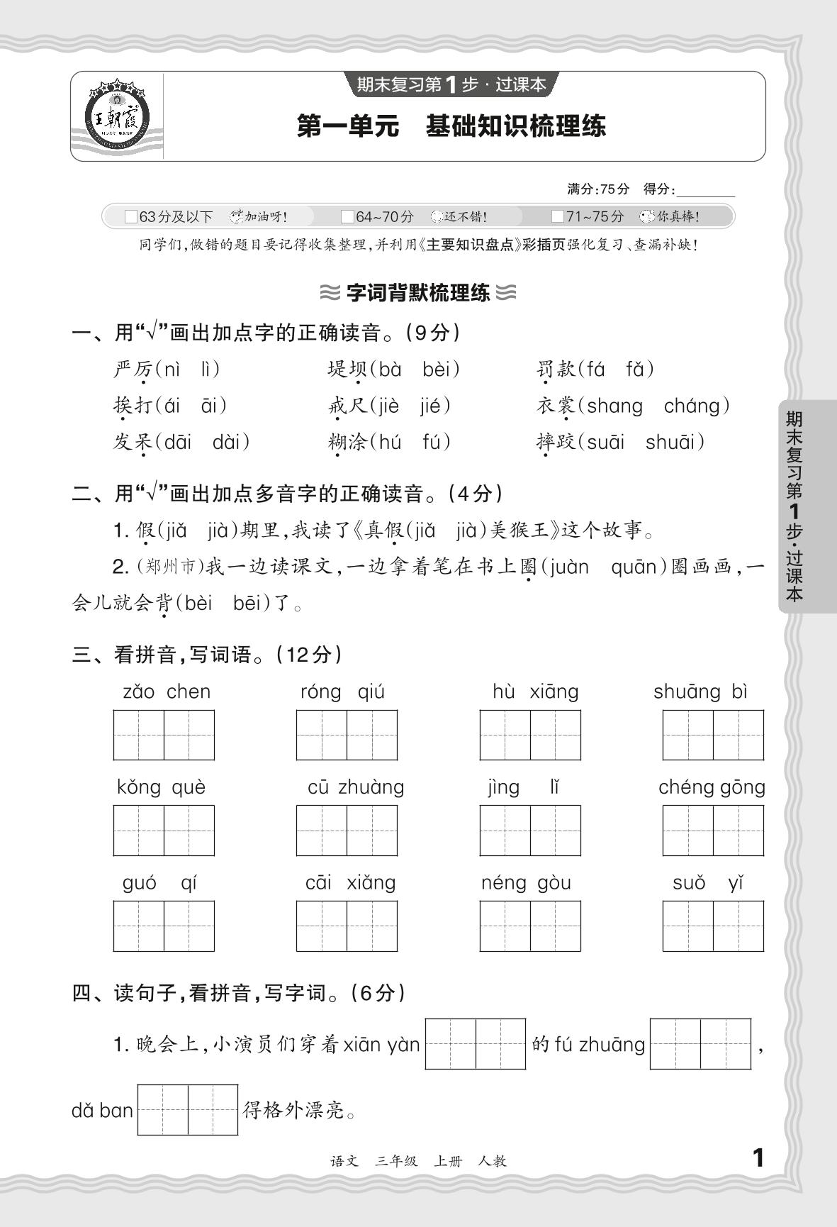 2023秋上册三年级语文人教版 期末过课本QMB版·第一单元 基础知识梳理练