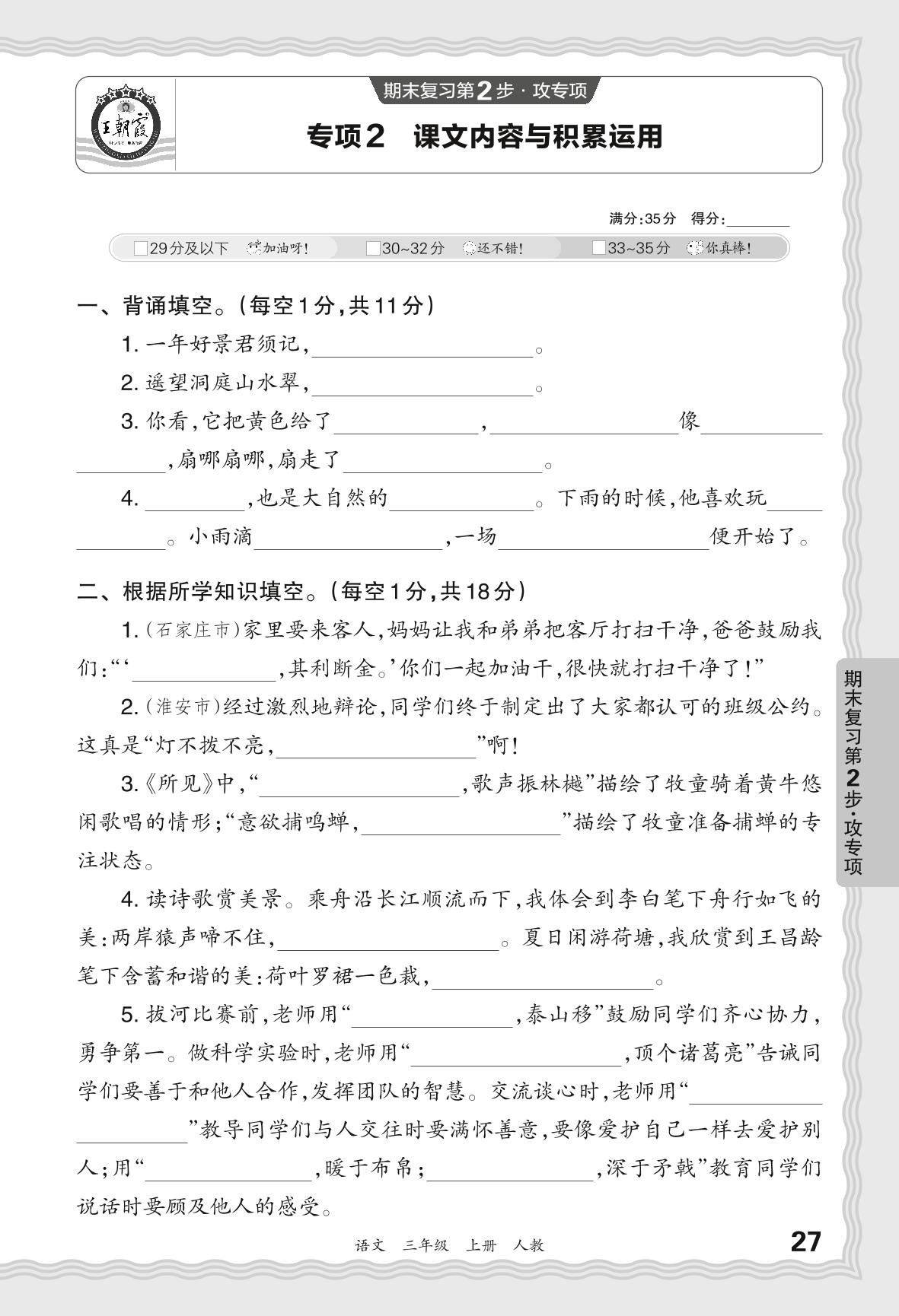 2023秋上册三年级语文人教版 期末专项·课文内容与积累运用【2】
