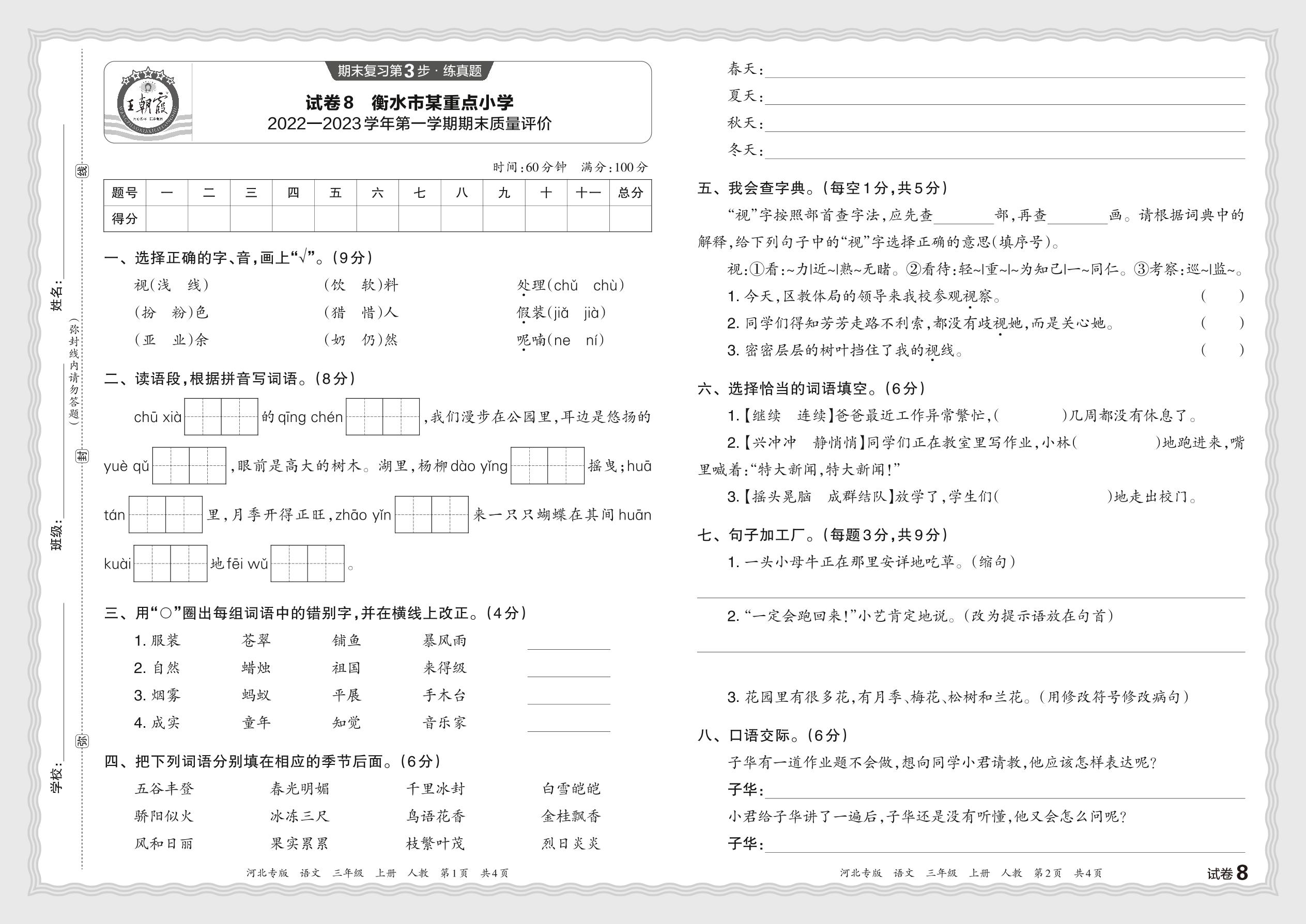 河北省衡水市某重点小学2022—2023学年第一学期期末质量评价(人教版)【8】