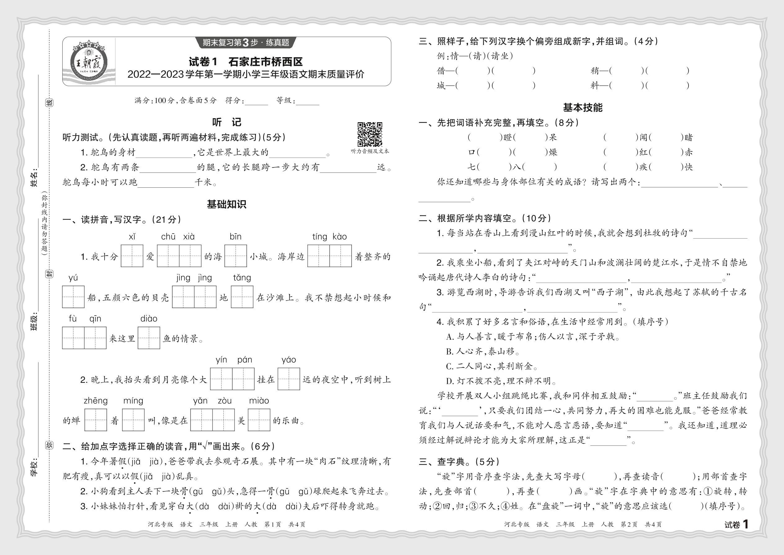 河北省石家庄市桥西区2022—2023学年第一学期小学三年级语文期末质量评价(人教版)【1】