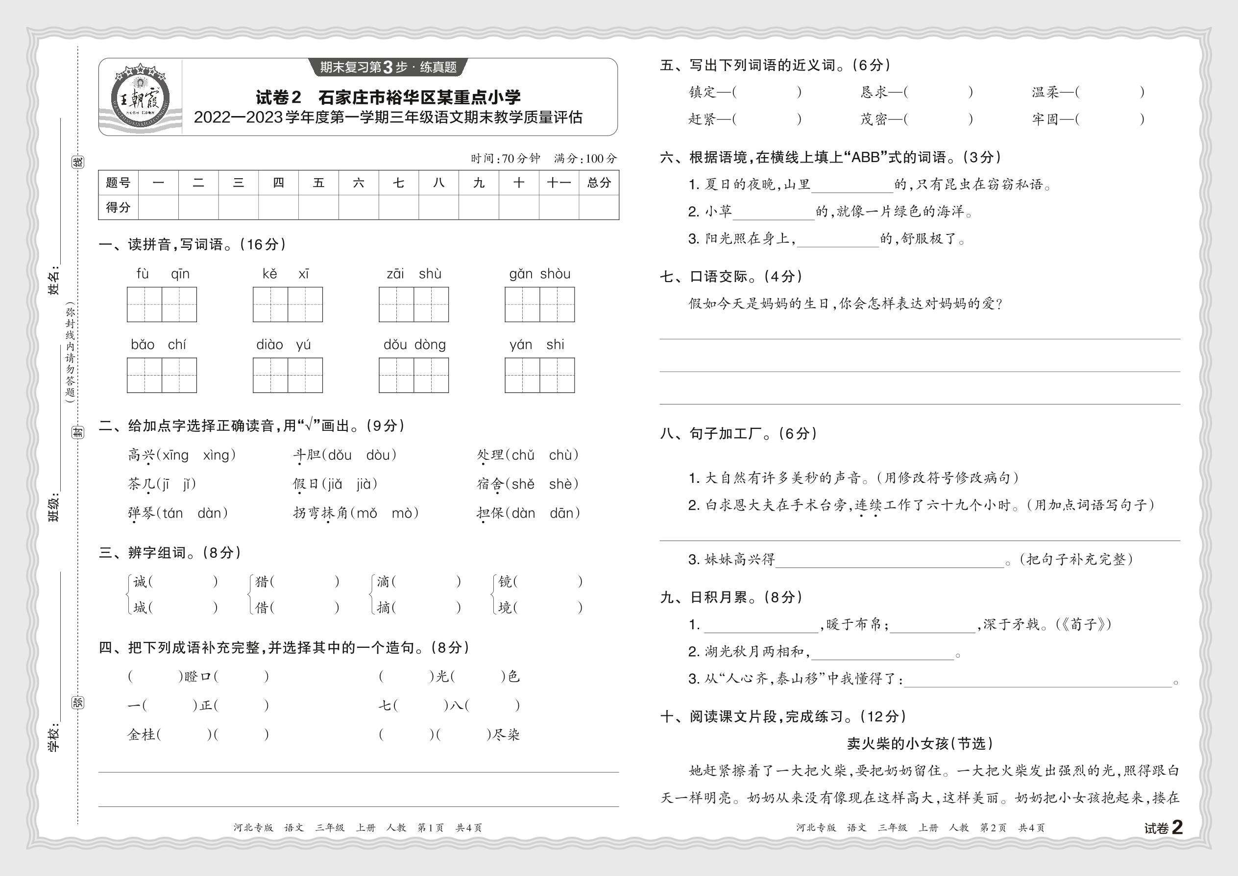 河北省石家庄市裕华区某重点小学2022—2023学年度第一学期三年级语文期末教学质量评估(人教版)【2】