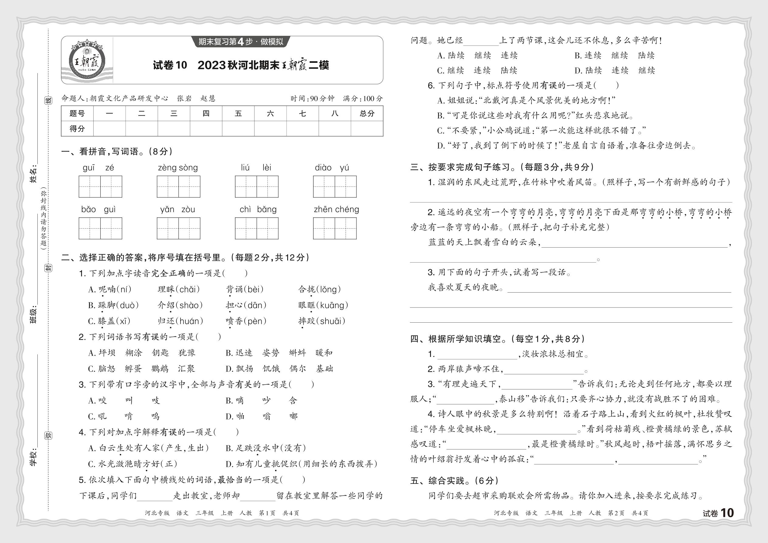 2023秋上册三年级语文人教版 河北期末王朝霞二模