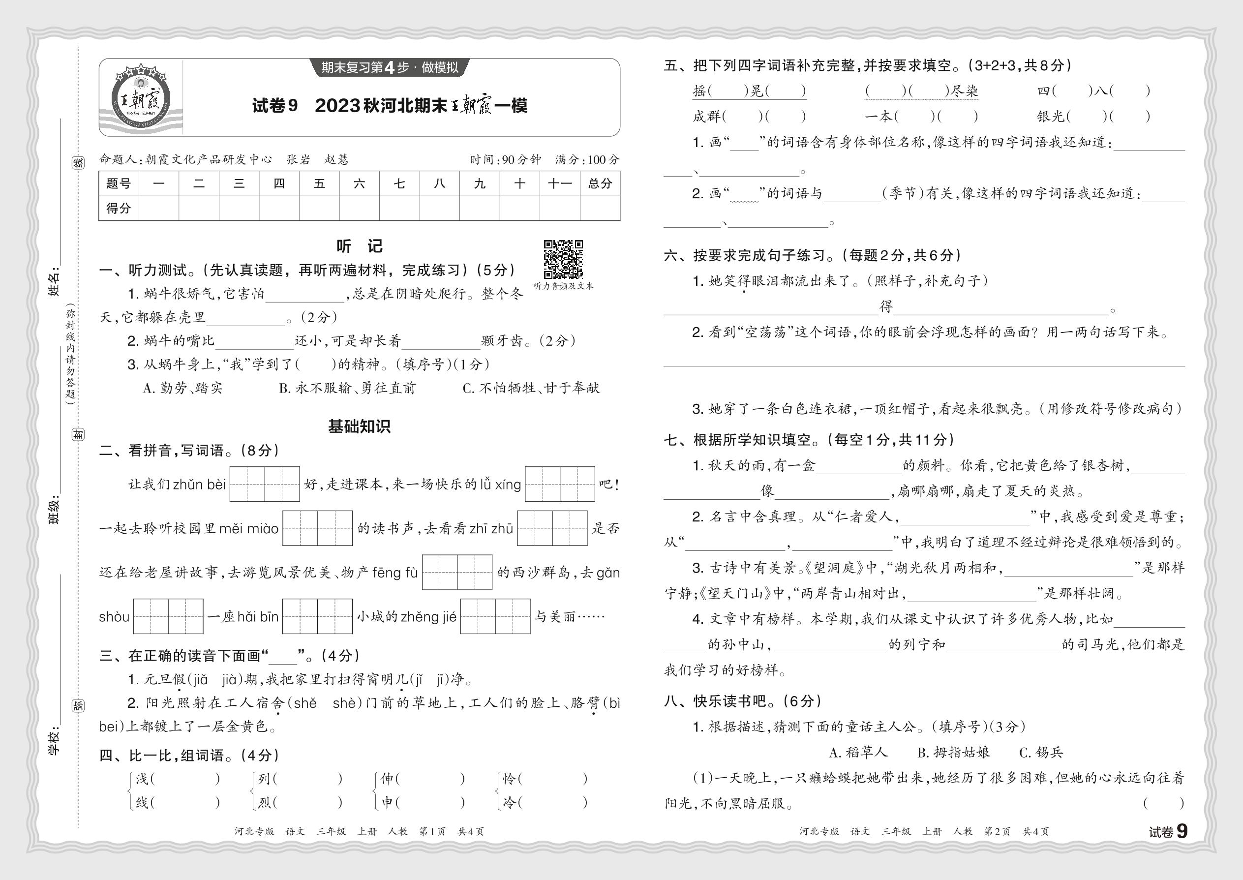 2023秋上册三年级语文人教版 河北期末王朝霞一模