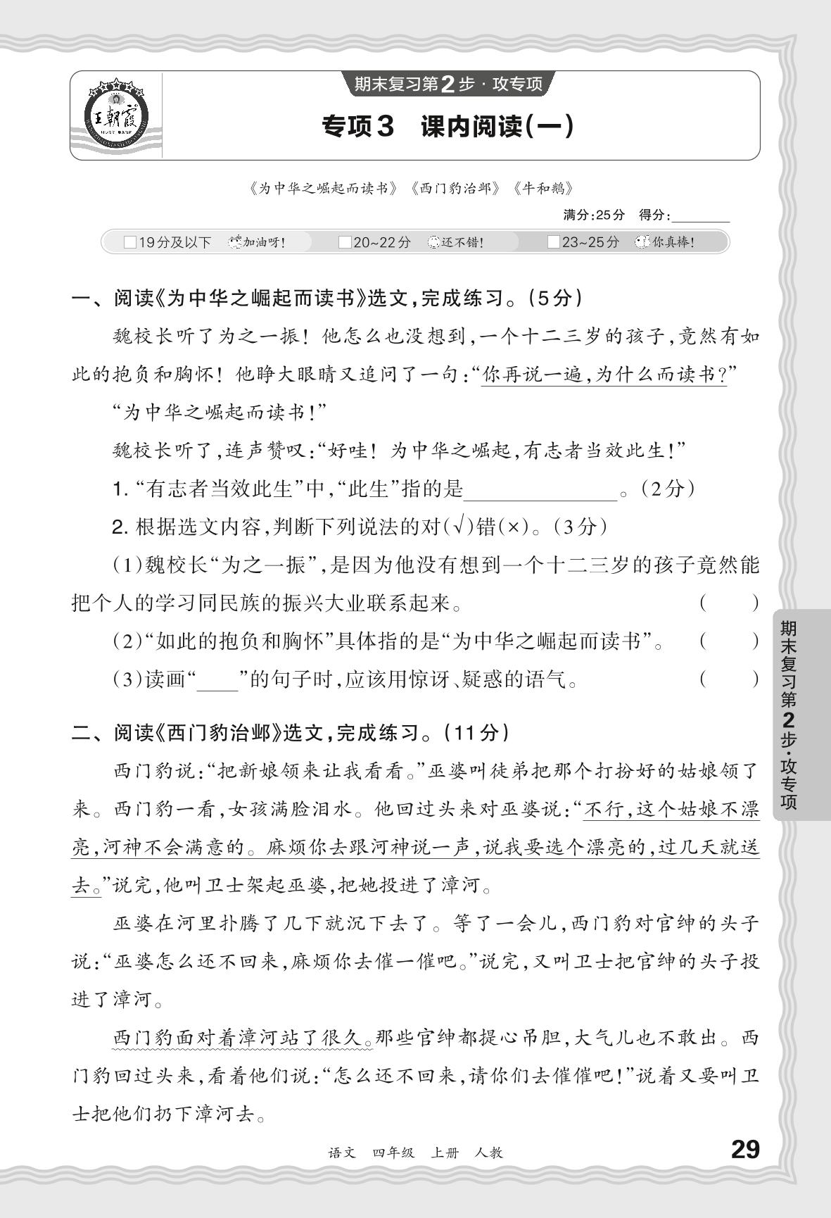 2023秋上册四年级语文人教版 期末专项·课内阅读(一)【3】