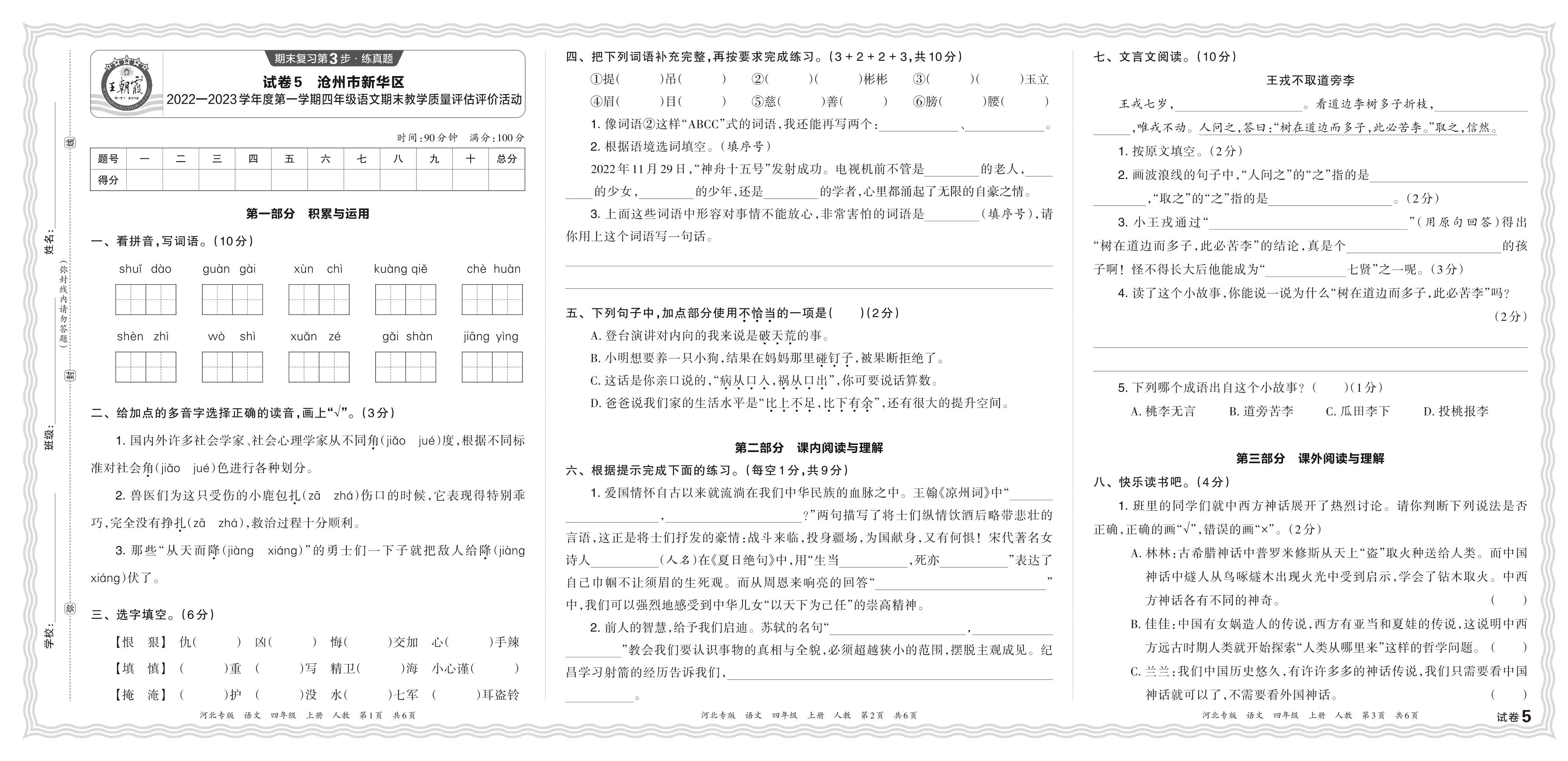 河北省沧州市新华区2022—2023学年度第一学期四年级语文期末教学质量评估评价活动(人教版)【5】