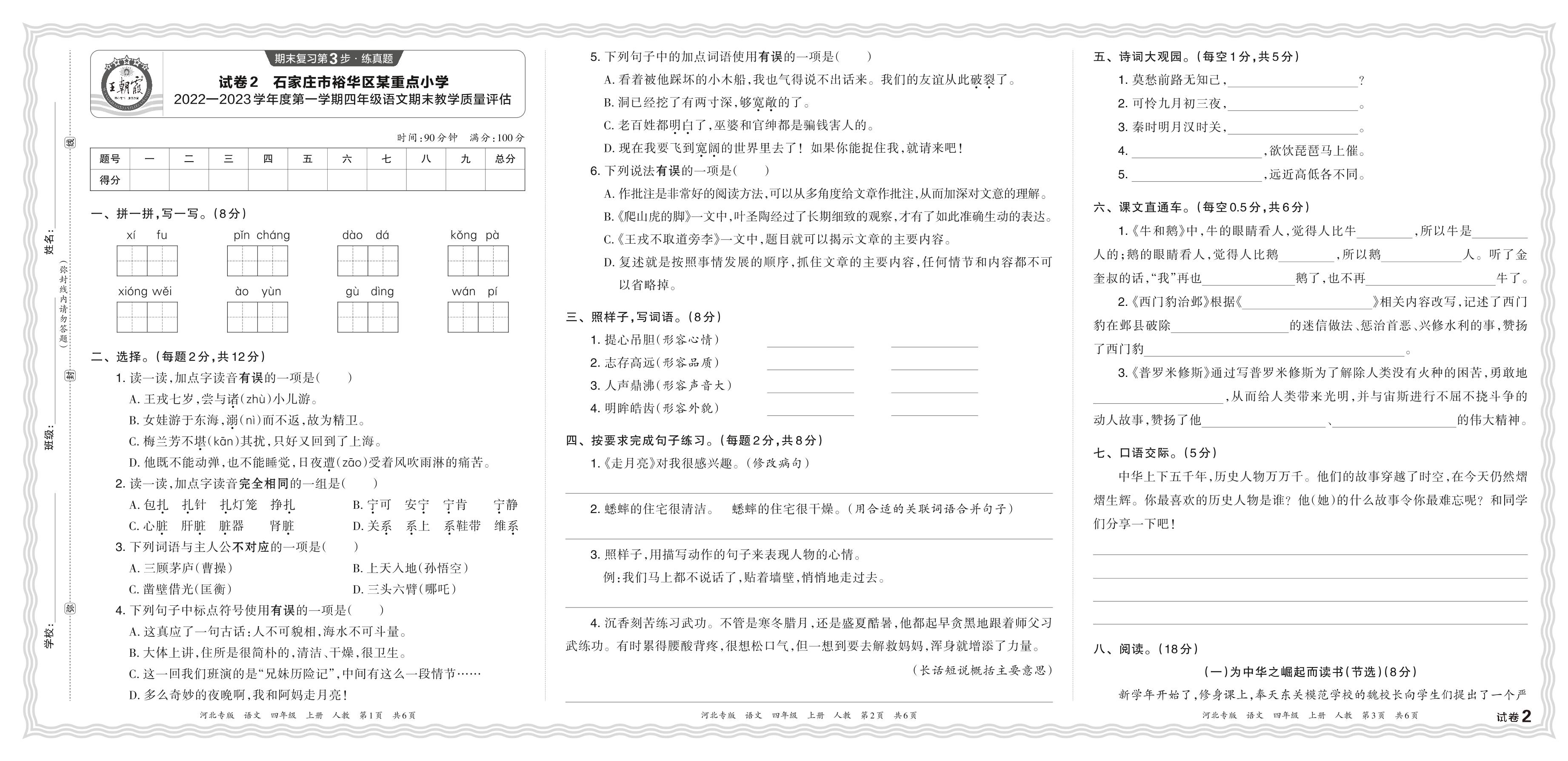 河北省石家庄市裕华区某重点小学2022—2023学年度第一学期四年级语文期末教学质量评估(人教版)【2】