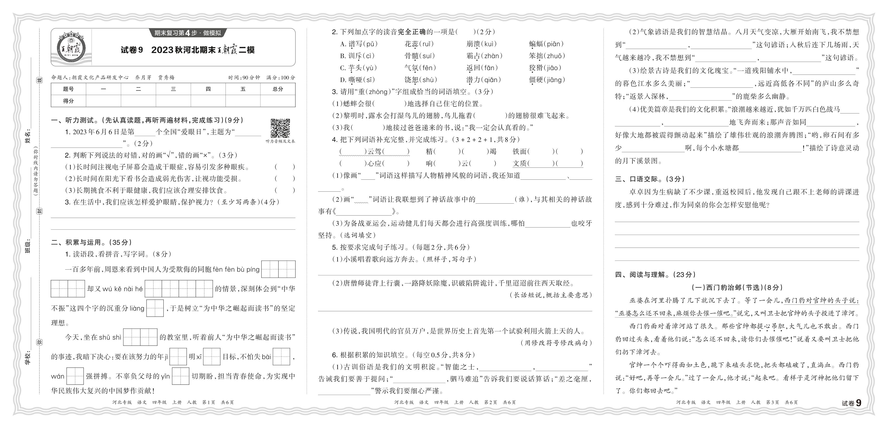 2023秋上册四年级语文人教版 河北期末王朝霞二模