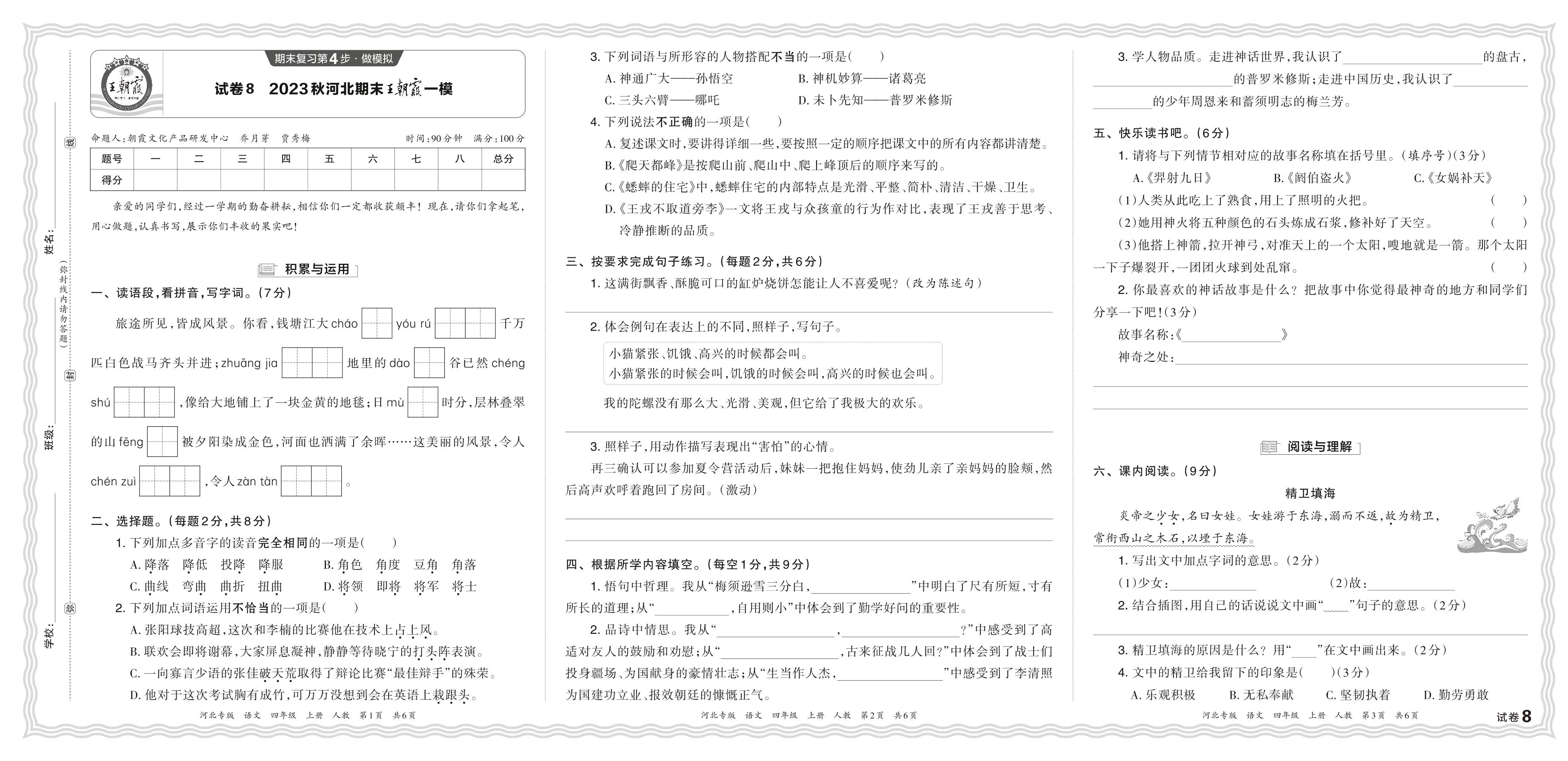 2023秋上册四年级语文人教版 河北期末王朝霞一模