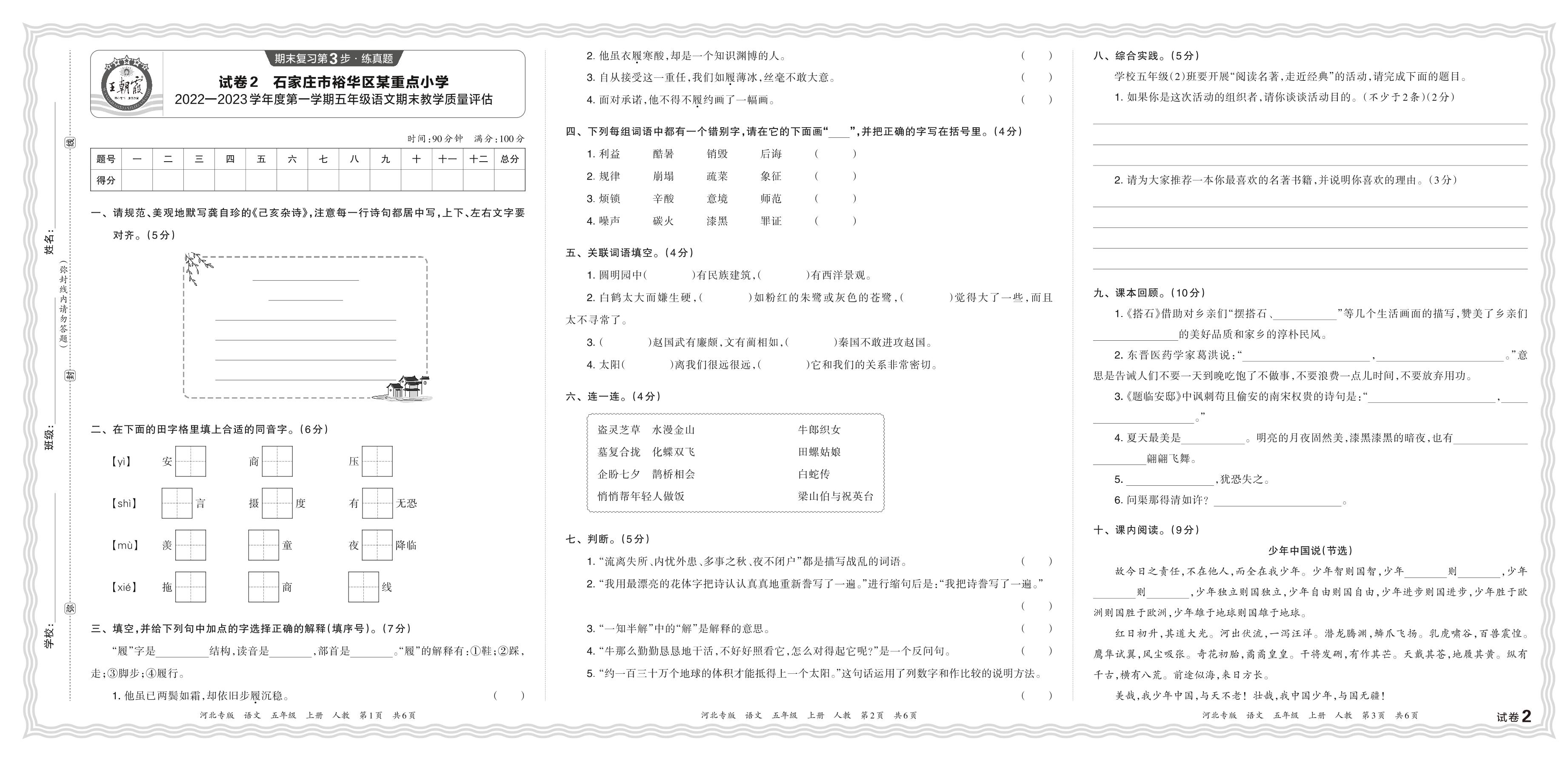 河北省石家庄市裕华区某重点小学2022—2023学年度第一学期五年级语文期末教学质量评估(人教版)【2】
