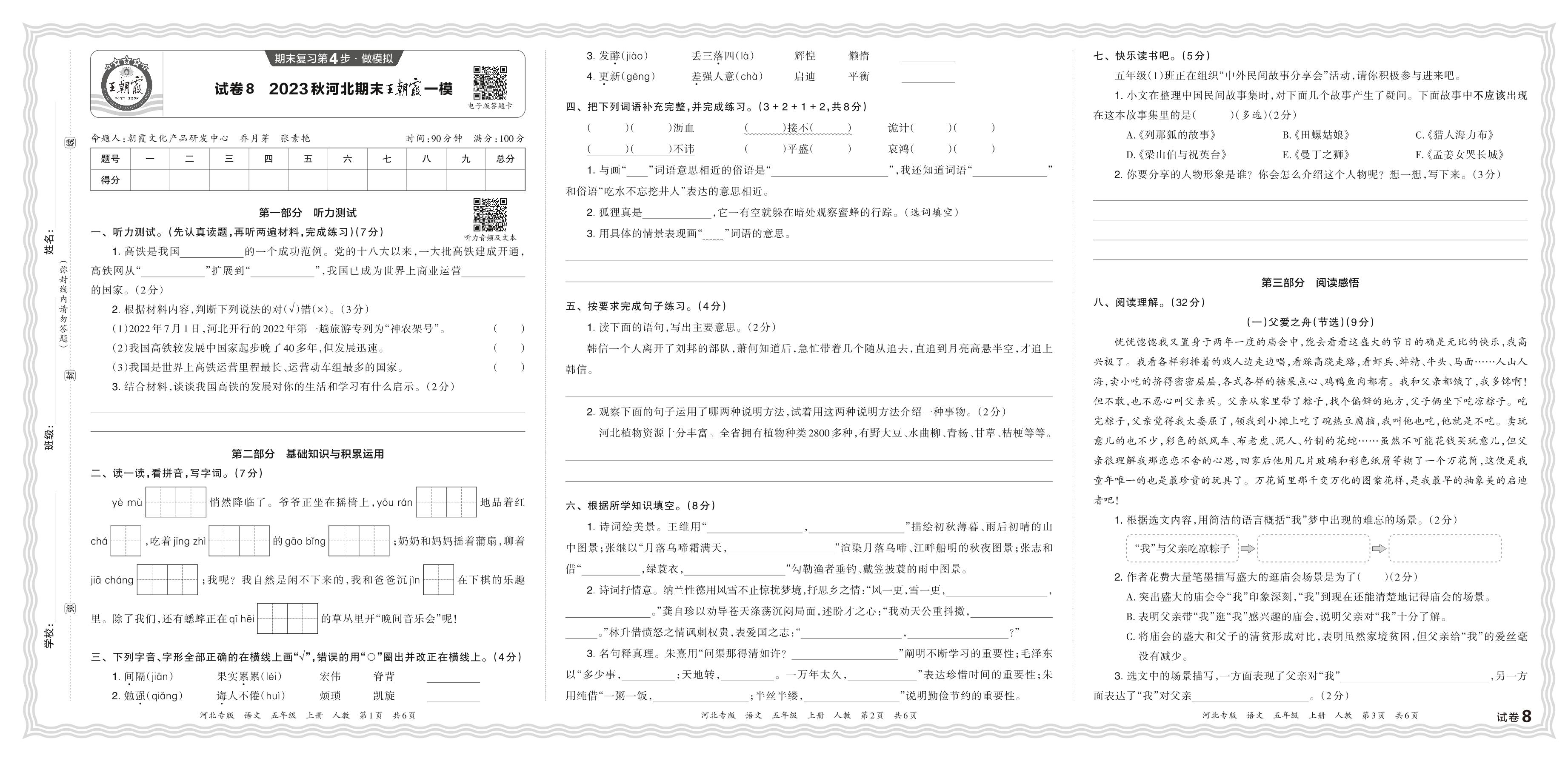 2023秋上册五年级语文人教版 河北期末王朝霞一模